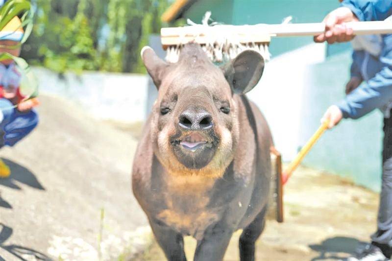 保育员小张一边帮花呗梳毛,一边在它耳边关照着,“我真舍不得,照顾它那么久,总有感情,我不知道它是不是可以接好运,但是能照顾花呗,我就觉得挺好运的。”小张回忆,去年9月,工作人员驱车前往上海迎接南美貘。虽然当天下着雨,但是整个串笼、运输的过程都很顺利。