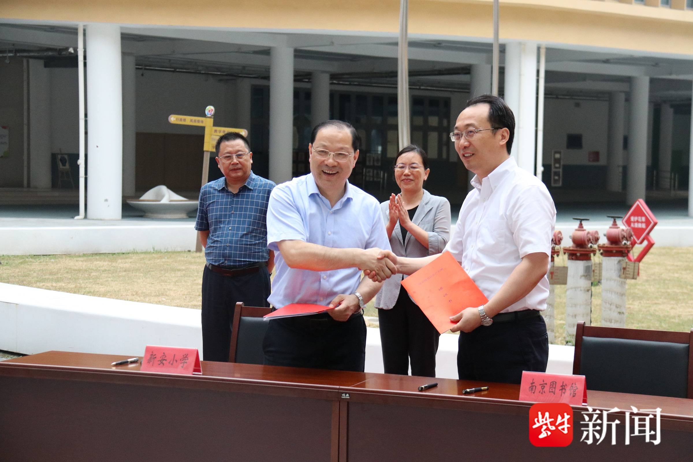 陈军馆长与张大冬校长共同签署了南京图书馆与淮安市新安小学图书援建点共建协议。这标志着南京图书馆与新安小学的合作进入了新的阶段,双方将在图书资源、阅读推广等方面展开深度合作。