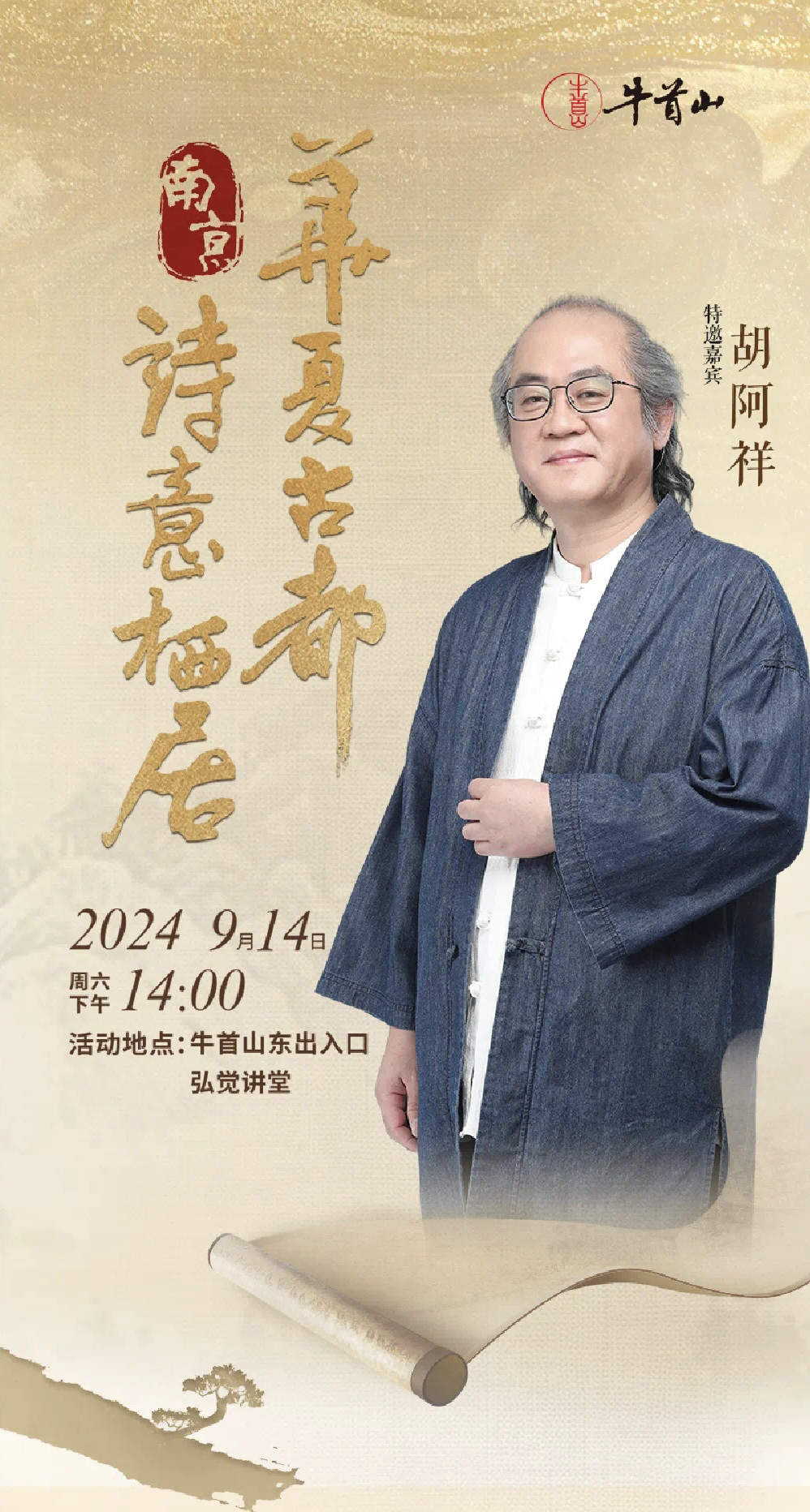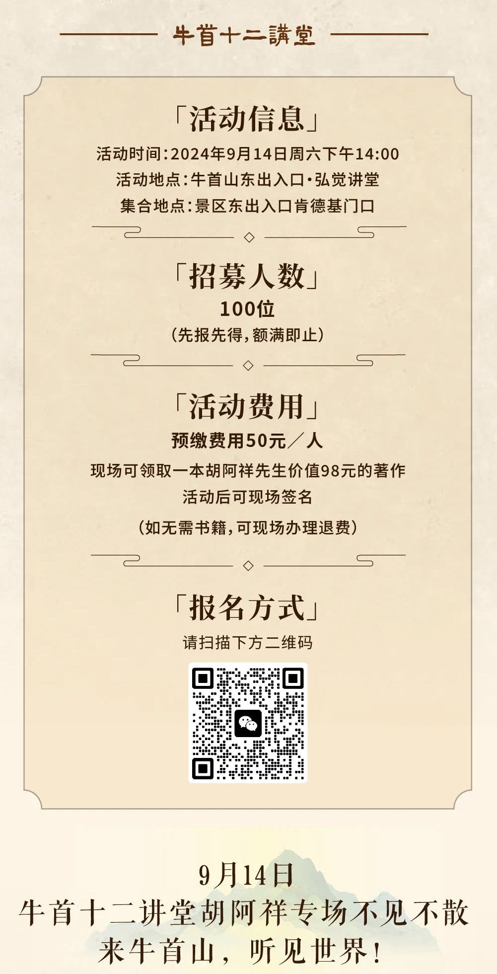 活动时间为2024年9月14日周六14:00,活动地点在牛首山东出入口·弘觉讲堂,集合地点在景区东出入口肯德基门口。现场招募100位,先报先得,额满即止。预缴费用50元/人,现场可领取一本胡阿祥先生价值98元的著作,活动后可现场签名。如无需书籍,可现场办理退费。