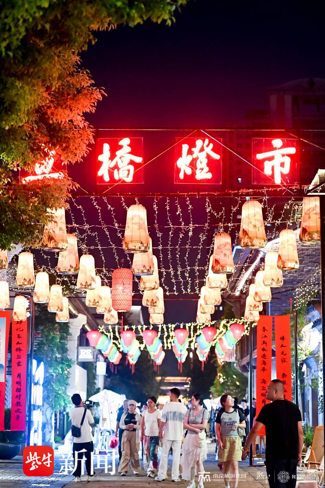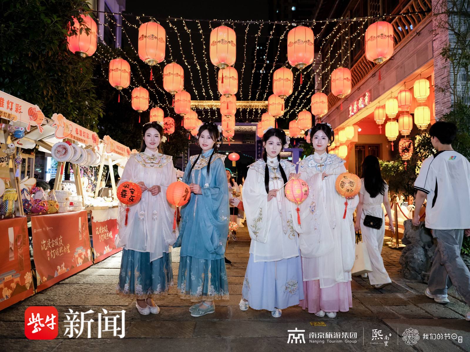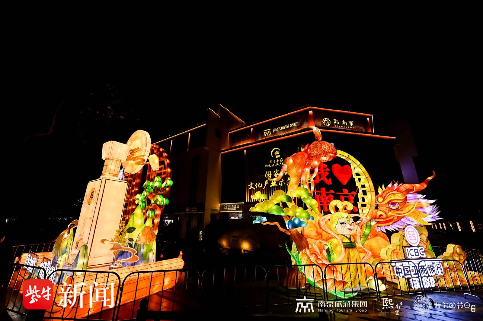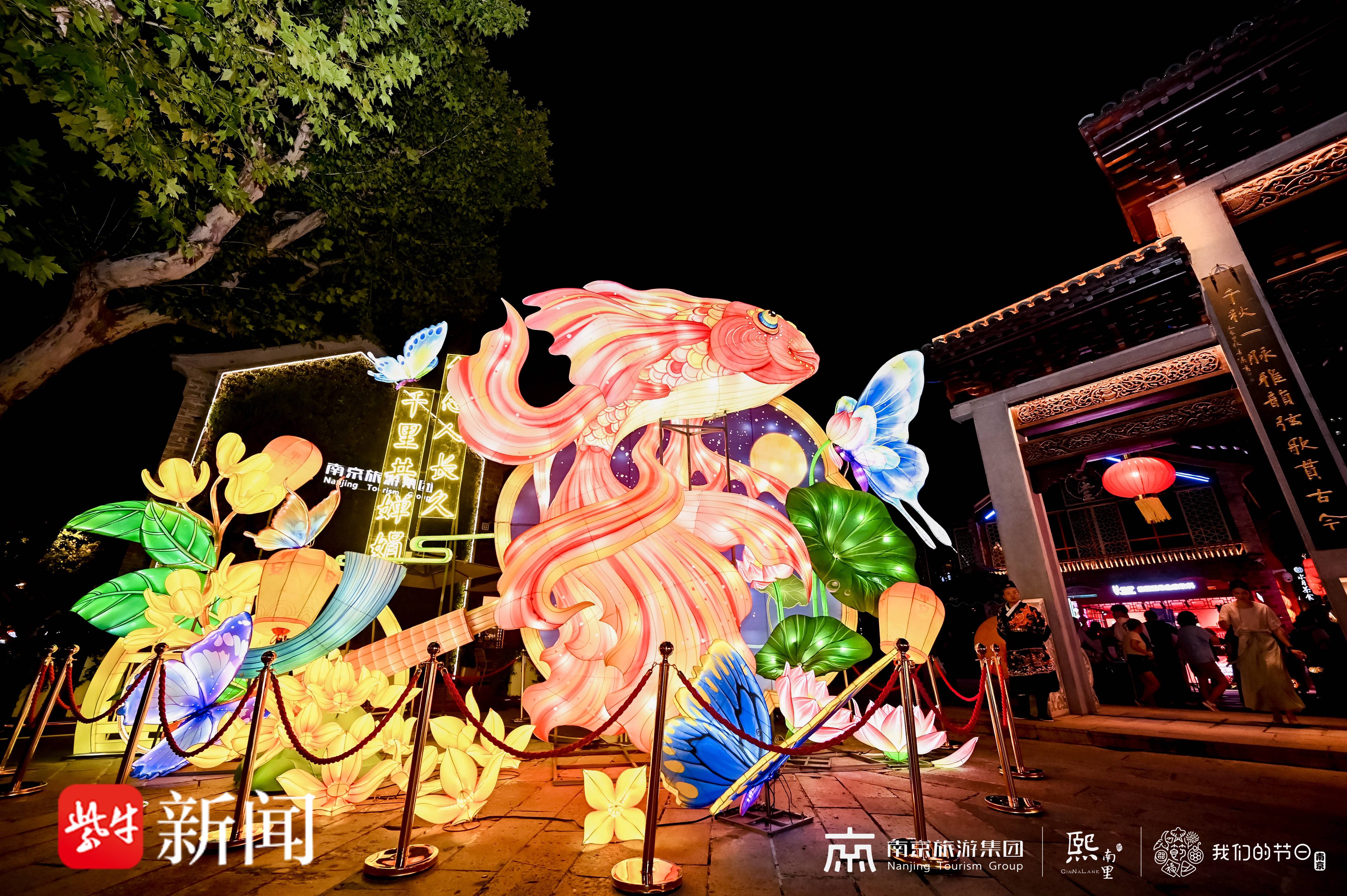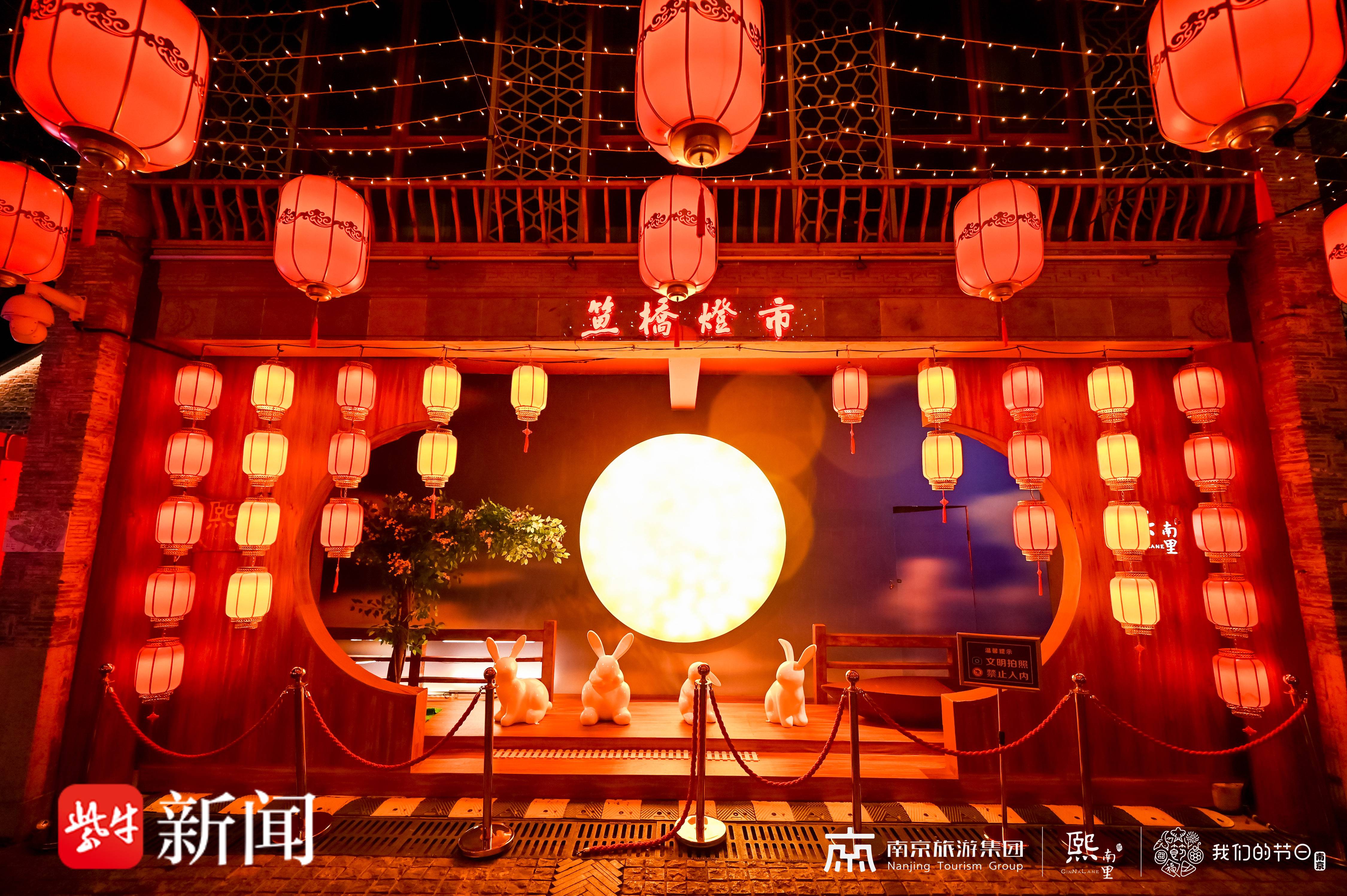 每年笪桥灯市的主角必然是各种造型独特又寓意美好的灯组。走进大板巷牌坊,一组高近5米的锦鲤灯矗立其旁,与古色古香的牌坊相映成趣。这组灯取名“千里共婵娟”,带着美好寓意,吸引了不少游客前来打卡拍照。沿着巷口继续深入,则可以看到一排排传统灯彩错落有致沿街悬挂,巷内不同历史时期的建筑也都配以不同主题的亮化。另一组人气灯组则坐落在升州路与中山南路交汇处,取名“拜月祈福”。鱼、龙、兔三大吉祥物共聚,一起向游客展示“拜月”这一传统中秋民俗。