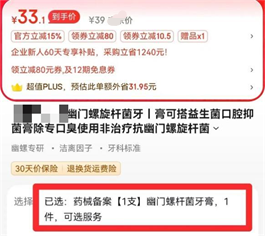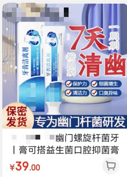 部分产品在线上销售页面宣称“消炎”“稳固牙齿松动”“治疗幽门螺旋杆菌”等疗效,误导消费者牙膏具有医疗效果,容易贻误医疗时机。专家提醒,幽门螺旋杆菌主要定植在胃内,如果感染了幽门螺旋杆菌需要去消化内科进行治疗。