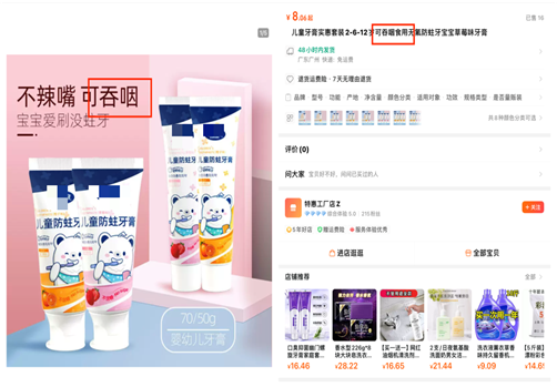 儿童牙膏应当在销售包装可视面标注“在成人监护下使用”“不能食用”“谨防吞咽”等相关警示用语。但在本次调查中,发现有儿童牙膏产品销售页面及标题标注了“可吞咽”的字样。