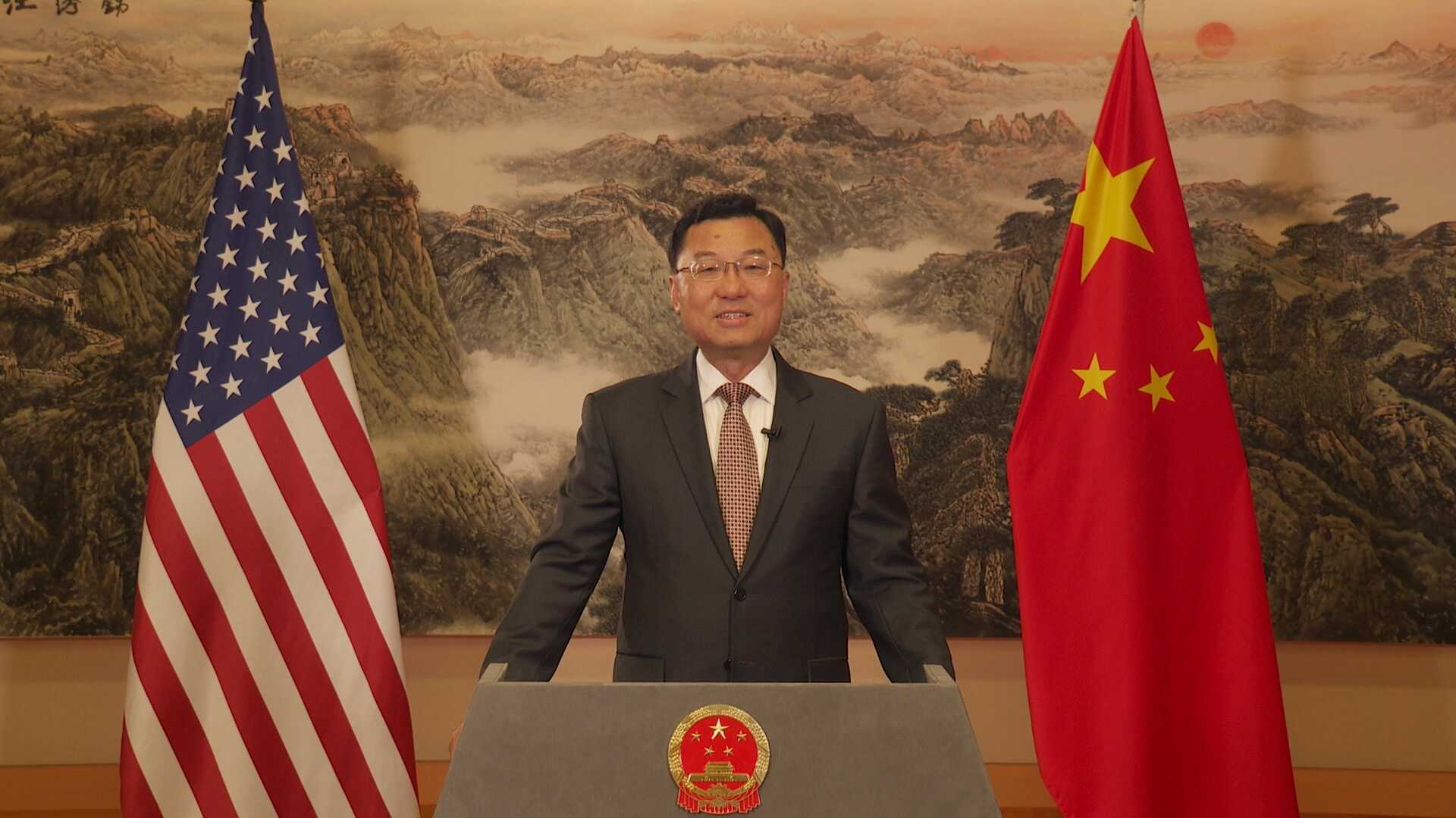 2024年9月22日,中国驻美国大使谢锋以视频方式在华盛顿侨界庆祝中华人民共和国成立75周年暨中美建交45周年晚宴上发表致辞。
