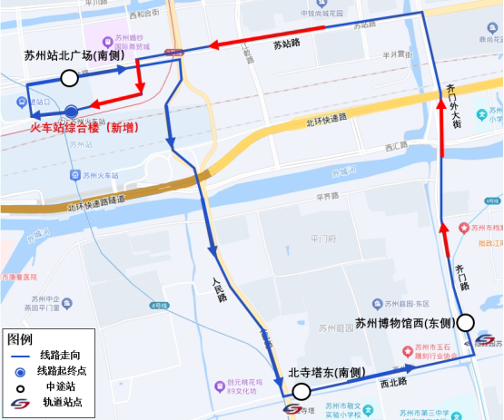 “姑苏旅游定制公交”线路走向为:去程:火车站综合楼、苏站路、人民路、西北街、齐门路、苏州博物馆西;返程:苏州博物馆西、齐门外大街、苏站路、火车站综合楼。停靠站点:去程:火车站综合楼、苏州站北广场(南侧)、北寺塔东(南侧)、苏州博物馆西(东侧);返程:苏州博物馆西(东侧)、火车站综合楼。营运时间:10月1日-10月7日 09:00-18:00,发车时间:15-20分钟。
