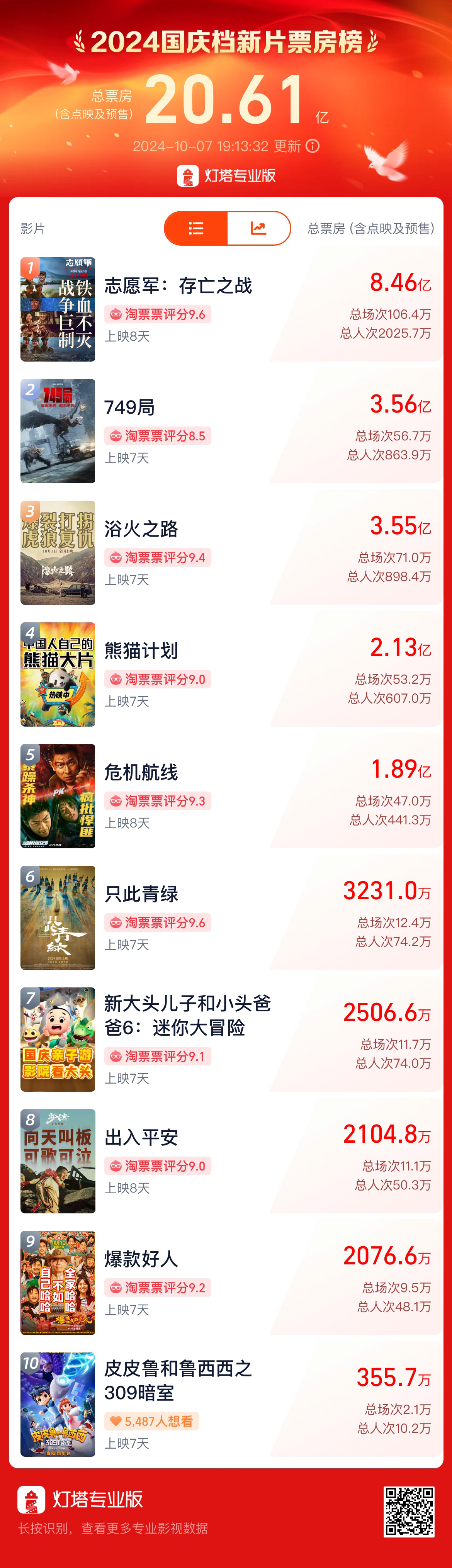 据灯塔专业版,截至10月7日19点,2024国庆档新片总票房(含点映及预售)达20.61亿,《志愿军:存亡之战》《749局》《浴火之路》为票房前三名。灯塔专业版数据分析师陈晋告诉记者,《志愿军:存亡之战》连续6天单日票房破亿,表现最稳定,是国庆档市场最大基石。