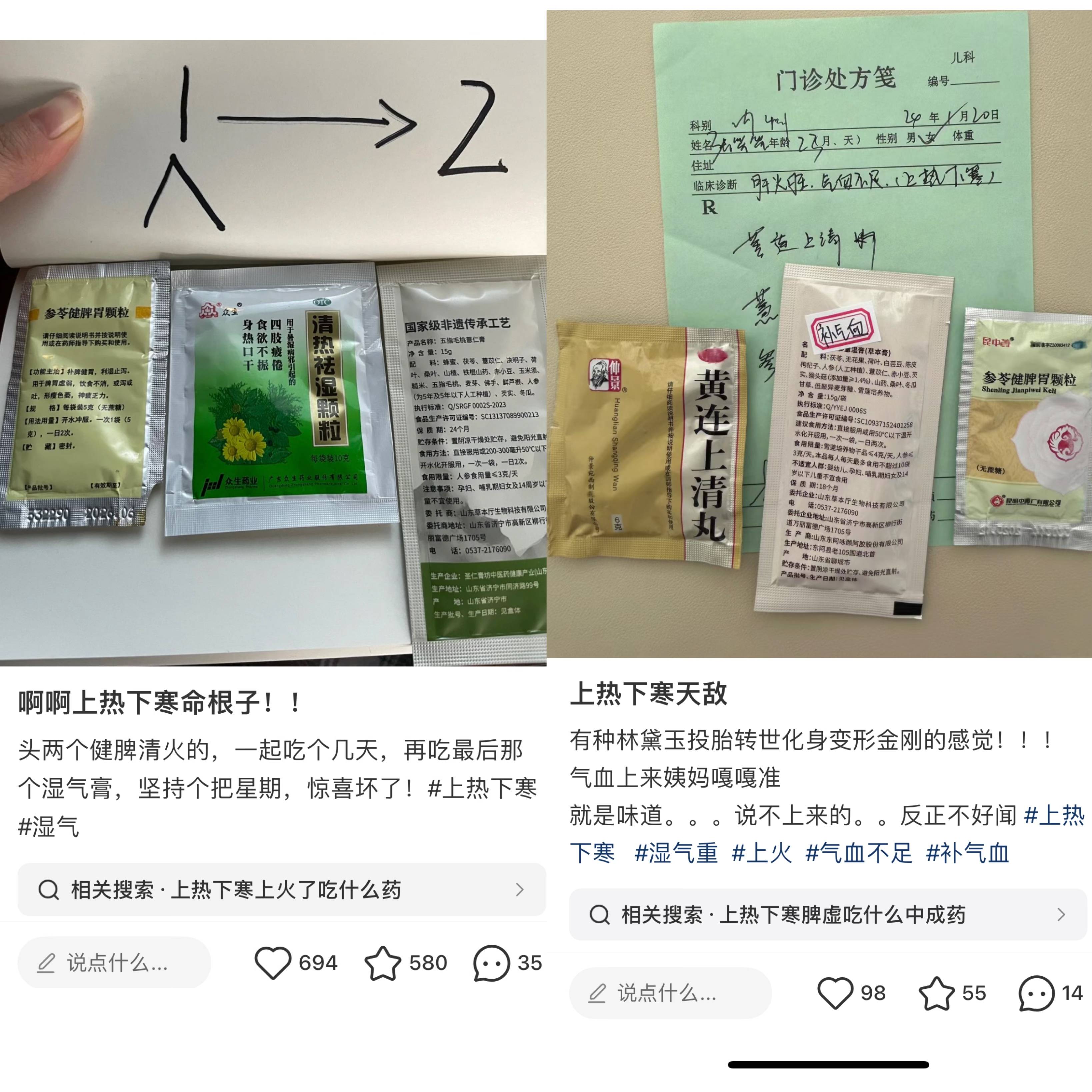 记者注意到,在社交平台“上热下寒”的话题高达1.5亿浏览,相关求助贴、经验分享层出不穷:“上热下寒就是脾胃堵了”“引火下行最好的动作是金鸡独立”“立秋后要用花椒拼命泡脚”……然而,最近有网友更是建议直接“上中药”:先服用黄连上清丸清火,再用参苓健脾胃颗粒,最后再进行补气血,并称对“上热下寒”有“奇效”,引得不少人效仿。专家提醒,这种调理思路存在很大的局限性和风险。