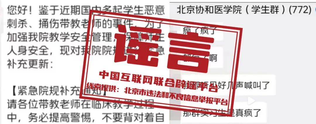 真相:近日,一张北京协和医院(总院通知群)在群内发布的通知截图在网络上流传,截图显示“为了加强我院教学安全管理”“请各位带教老师在临床教学过程中务必提高警惕”,通知落款为“北京协和医院教学管理部门”,发布时间为2024年10月13日。相关发帖还显示,上述通知与“该院学生刺伤老师”事件有关。对此,10月17日晚,北京协和医院发布辟谣声明称,部分社交媒体和网络平台流传关于“北京协和医院学生刺伤带教老师”的信息,经核查证实为虚假信息,已向公安机关报案。(来源:“北京网络举报”微信公众号、@北京协和医院)