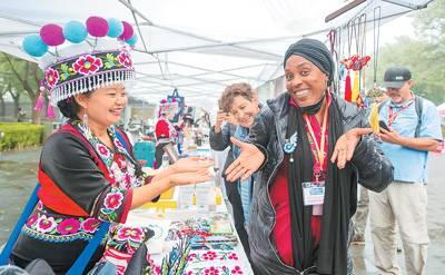 外国游客在“非遗彝绣秀北京”活动期间体验佩戴彝绣工艺品。