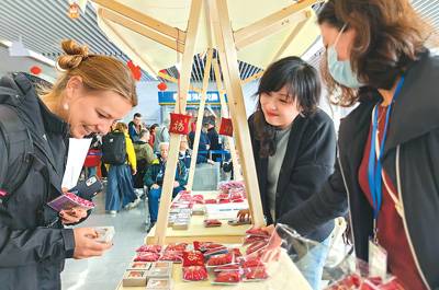 入境游客在上海吴淞口国际邮轮港到达大厅设立的摊位前驻足,了解文创产品。