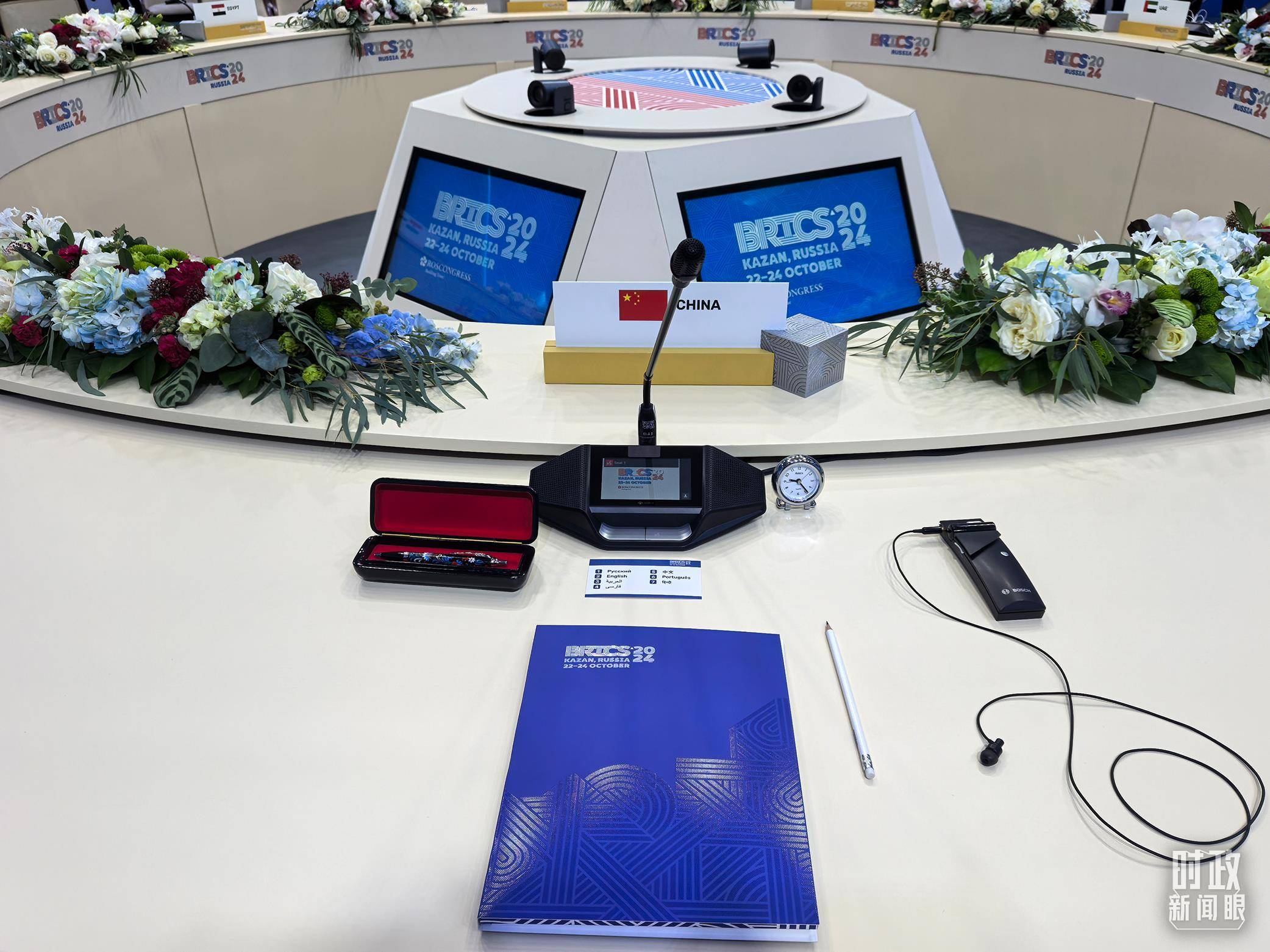 △ 金砖国家领导人小范围会议现场的会议桌。(总台央视记者程铖拍摄)