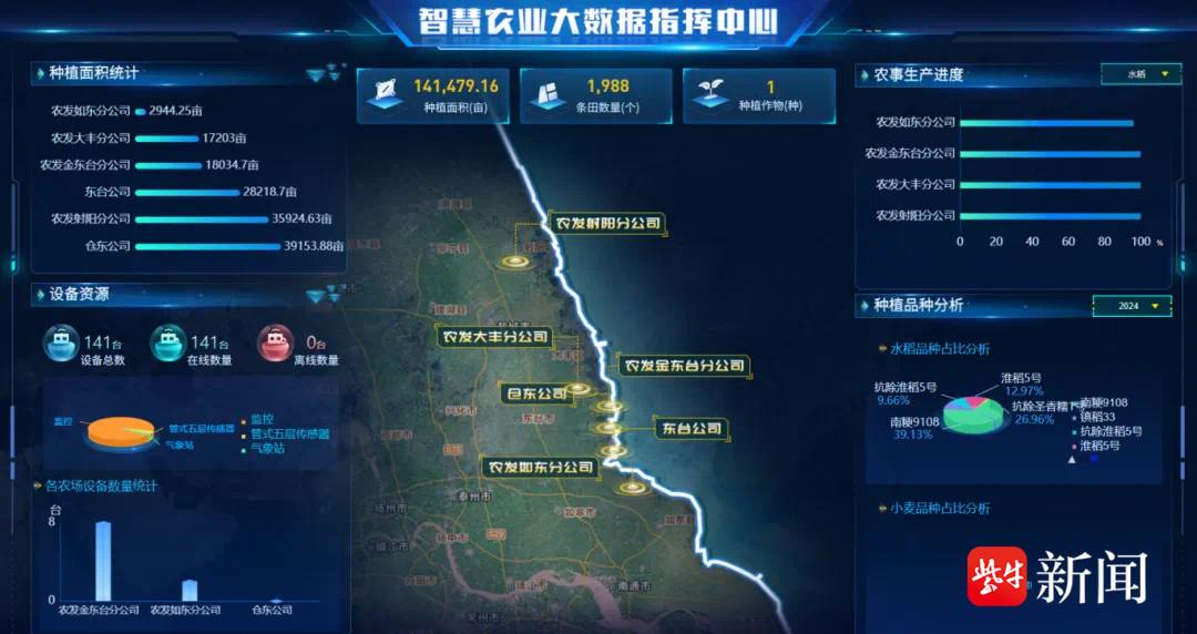 “我们的智慧平台可以利用遥感监控作物长势,图像数据直接连入智慧农业管理系统PC端和移动端,哪一块田熟了,哪一块还不够熟,打开平台,一清二楚。”江苏省沿海开发集团有限公司农业科技服务中心负责人薛延丰介绍,为了助力盐碱地变良田,省沿海集团建成了智慧农业大数据指挥中心,充分利用大数据、GIS、无人机遥感等技术手段,实时掌握区域作物布局与生长情况。