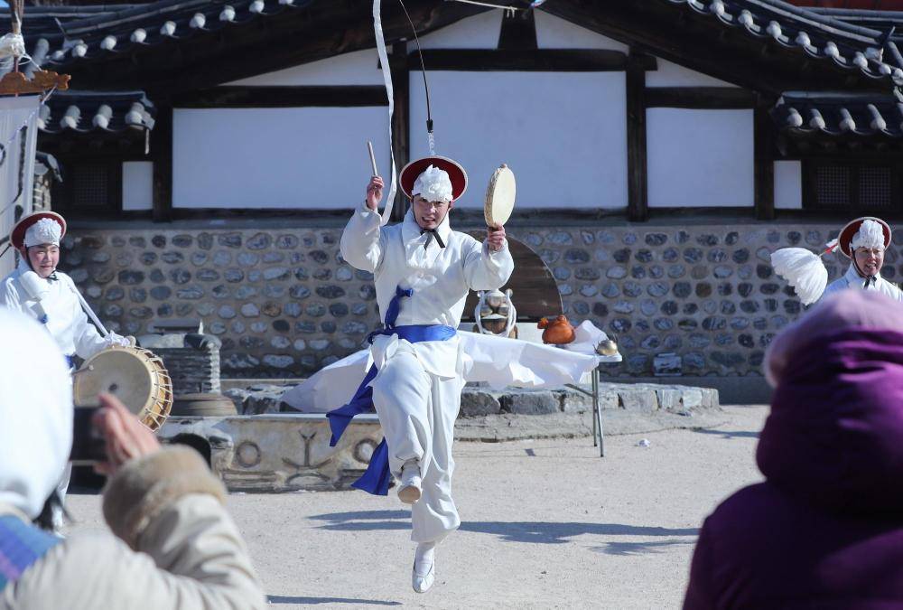 2023年12月22日,在韩国首尔南山谷韩屋村,演员进行传统民俗表演。新华社记者姚琪琳摄