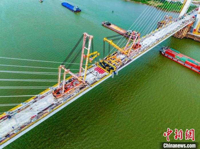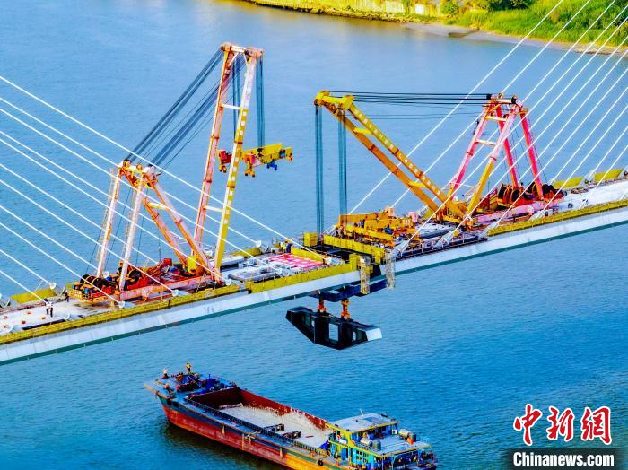 世界上跨度最大的无砟轨道斜拉桥——广湛高铁佛山特大桥跨东平水道斜拉桥31日顺利合龙。苏明 摄