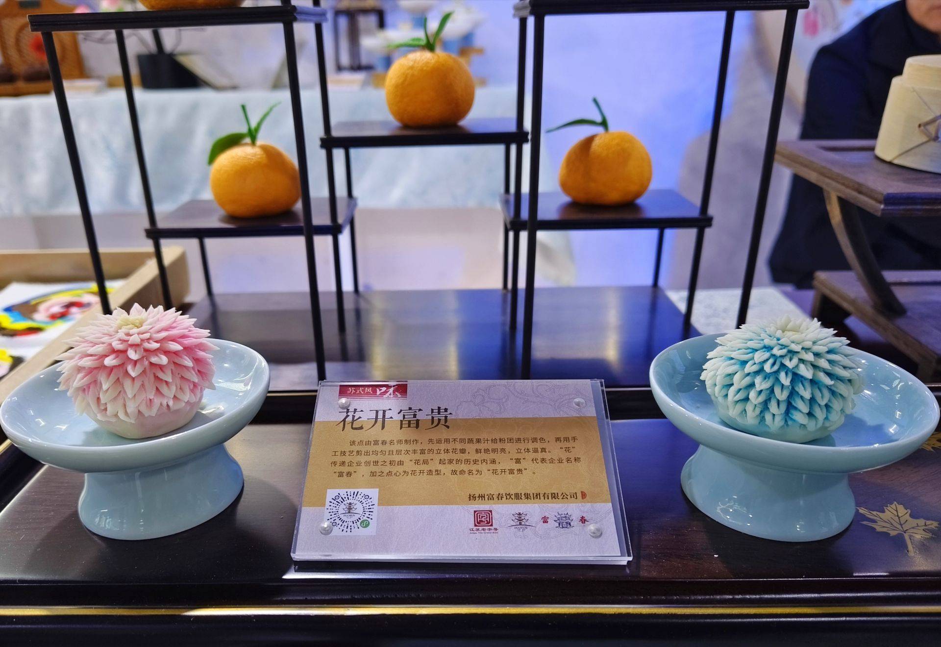 记者连线现场参展的扬州富春饮服集团有限公司总经理徐颖宏了解到,此次富春带着包括富春魁龙珠文创“灵龙Tea透”在内的多种糕点和魁龙珠茶组合,亮相进博会江苏人文交流展区。富春面点师朱正杨、茶艺师张剑围绕富春茶点制作技艺向来宾作推介。