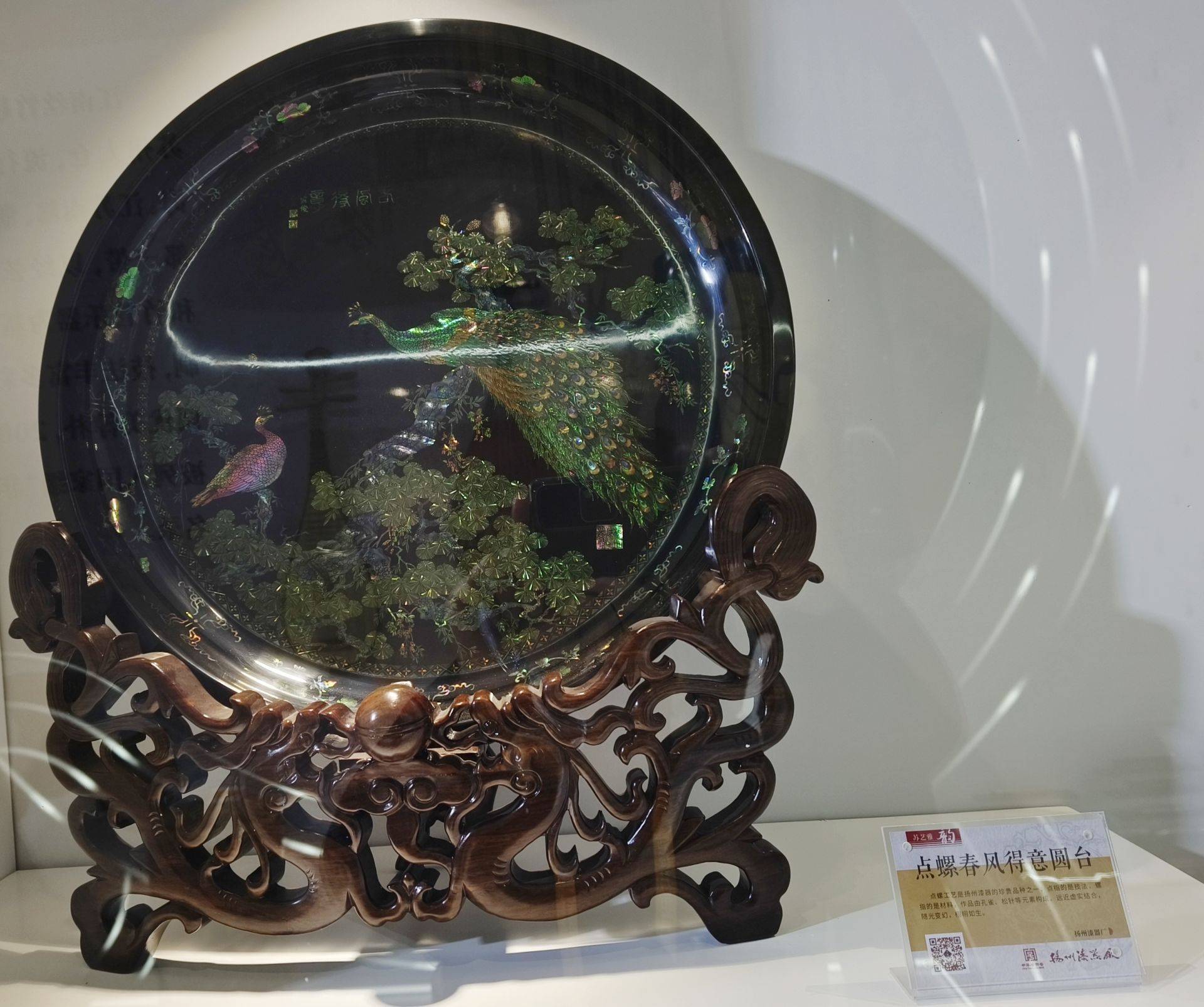 扬州漆器厂有限责任公司带上进博会的是大件漆器点螺《春风得意》圆台屏,向世界展示扬州漆器点螺工艺。该作品由孔雀、松针等元素构成一幅春意盎然的画面,层次突出、虚实结合,随光变幻、栩栩如生。