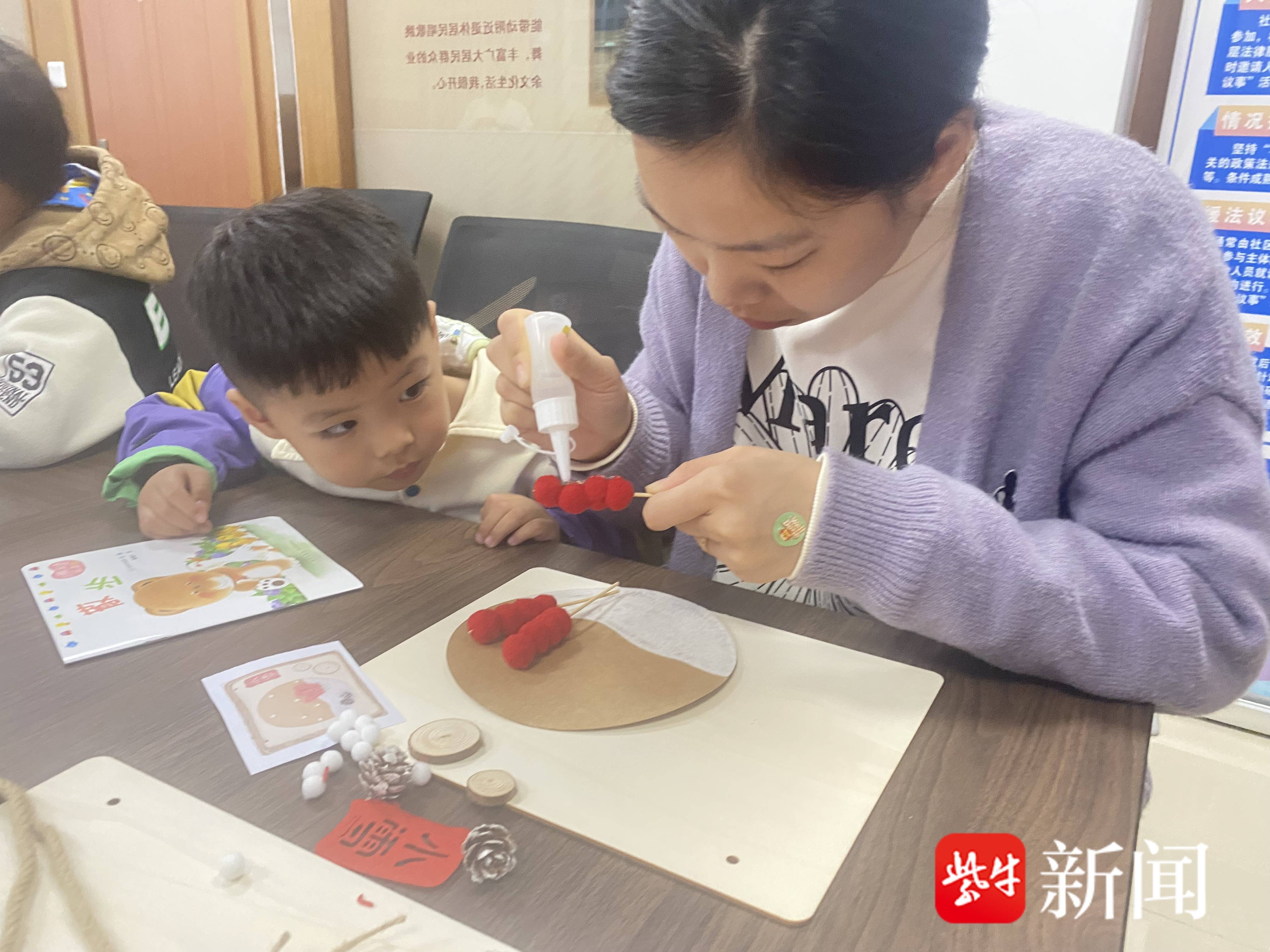 巧手迎小雪,为了提升小朋友与家长的参与感,工作人员带领大家共同制作“小雪”节气粘贴画手工。桌上摆满了各种材料,白色的棉花、彩色的卡纸、胶水等。大家纷纷拿起手中的材料,大家发挥创意,开始创作属于自己的 “小雪” 节气粘贴画。有的用牙签将红色绒球串成“糖葫芦”的样子,贴在的卡纸上,仿佛一幅冬日雪景图;有的用卡纸折出了小雪人,给它戴上帽子和围巾,可爱极了。在制作过程中,家长们负责图画的规划,孩子们负责创意与粘贴等步骤,大家相互协作。孩子们天马行空的想法得到了家长的支持和鼓励,家长们也在与孩子的互动中重温了童年的乐趣。每一个手工制品都承载着家庭的温暖和对小雪节气的独特理解,现场弥漫着浓浓的亲情和欢乐的氛围。