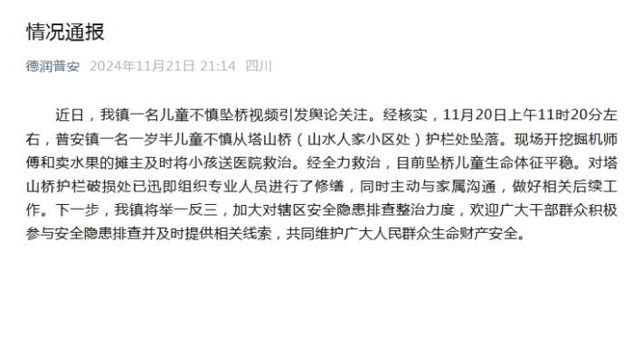 中新网11月22日电 据四川广元市剑阁县普安镇人民政府官方微信消息,近日,普安镇一名儿童不慎坠桥视频引发舆论关注。经核实,11月20日上午11时20分左右,普安镇一名一岁半儿童不慎从塔山桥(山水人家小区处)护栏处坠落。现场开挖掘机师傅和卖水果的摊主及时将小孩送医院救治。经全力救治,目前坠桥儿童生命体征平稳。对塔山桥护栏破损处已迅即组织专业人员进行了修缮,同时主动与家属沟通,做好相关后续工作。