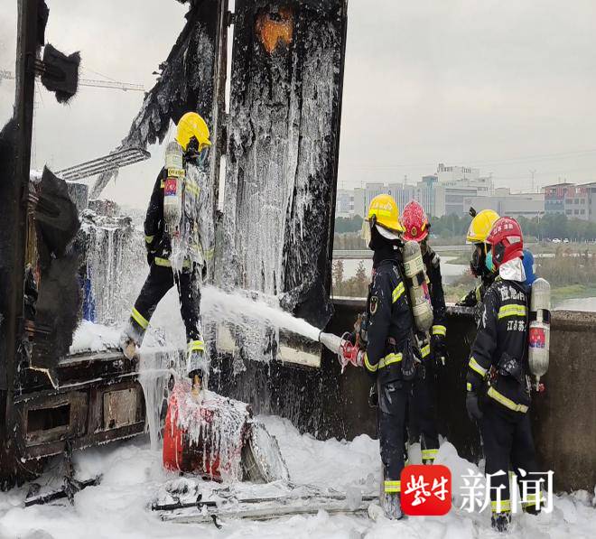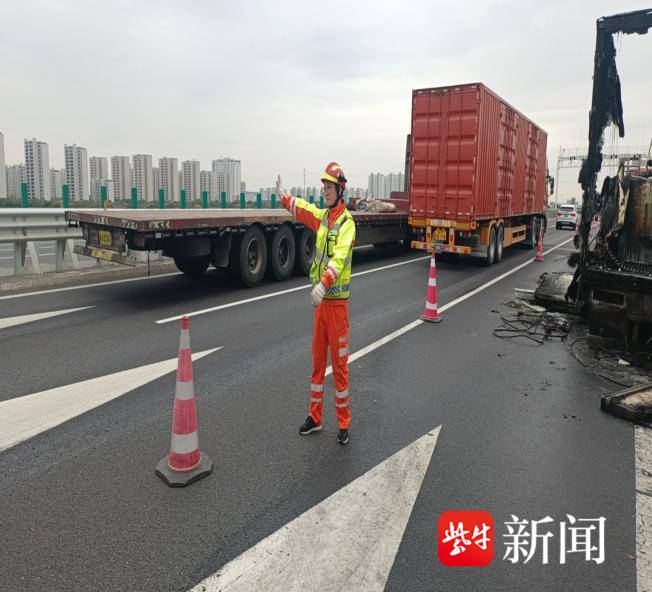 五分钟后,高速养护到达现场,布控安全警示区域,因火势较大,手提灭火器已无法完成有效灭火。为了快速扑灭大火,防止造成人员受伤,一方面,交警临时封闭全部车道,现场工作人员引导车辆有序驶离危险区域;另一方面因车辆停靠位置在桥面上,且着火点为车辆外侧,连邦救援(委外单位)使用吊车配合消防员控制火情,一个小时后,大火被扑灭。