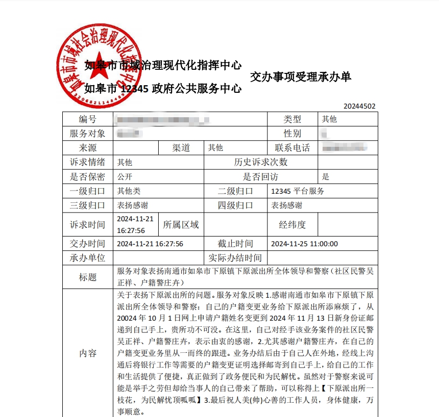 “下原派出所一枝花,为民解忧顶呱呱。”11月21日,如皋市公安局收到一份特别的“12345”政务服务便民热线工单,既不是业务咨询,也不是意见建议,而是一封表扬信,对下原派出所热情周到的服务表示了高度赞扬和诚挚感谢。