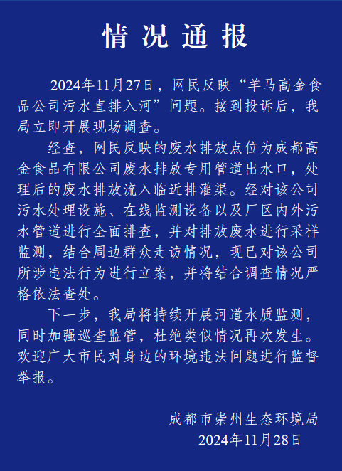 成都崇州生态环境局通报“一食品公司污水直排入河”问题:对该公司所涉违法行为进行立案