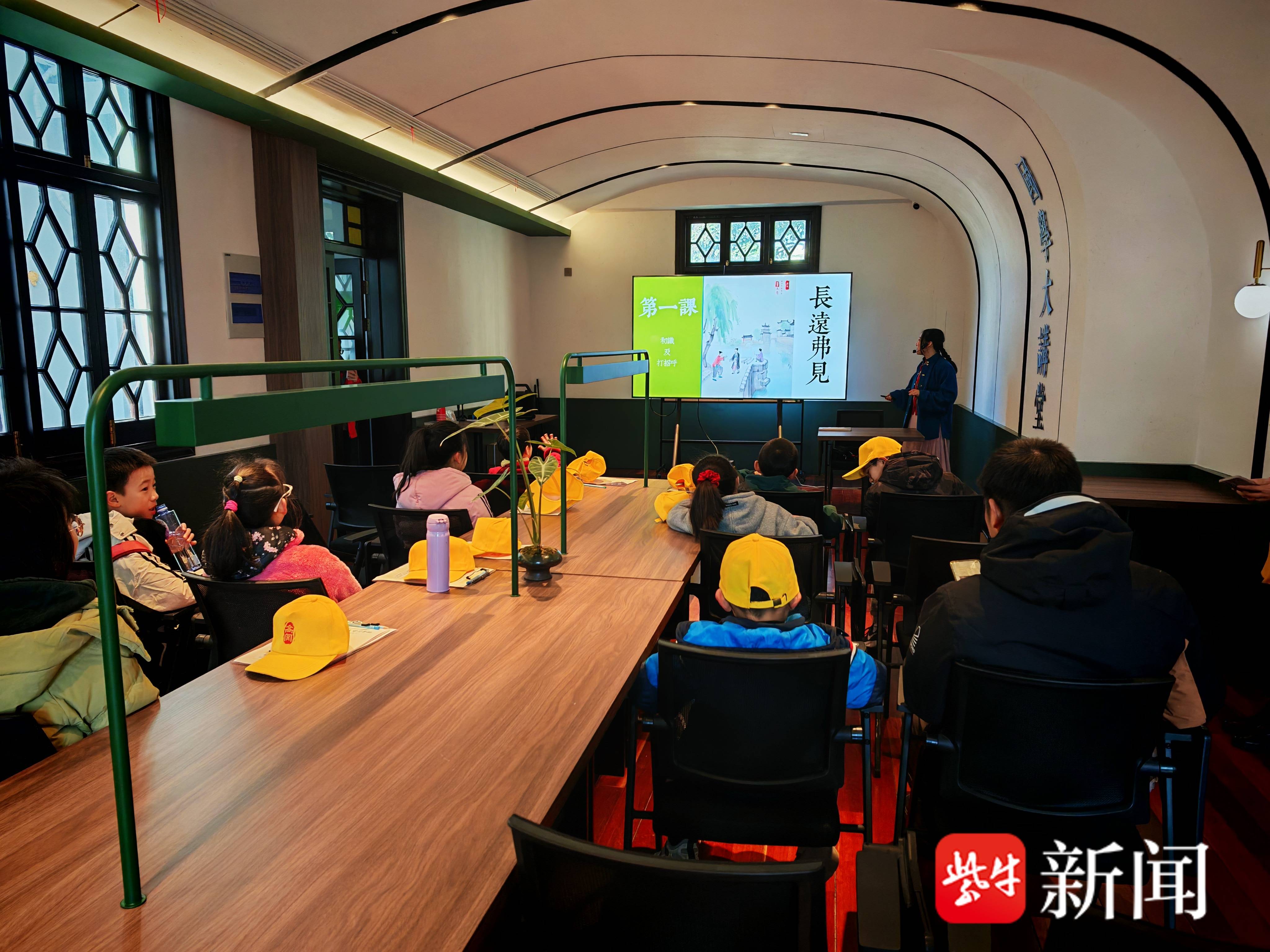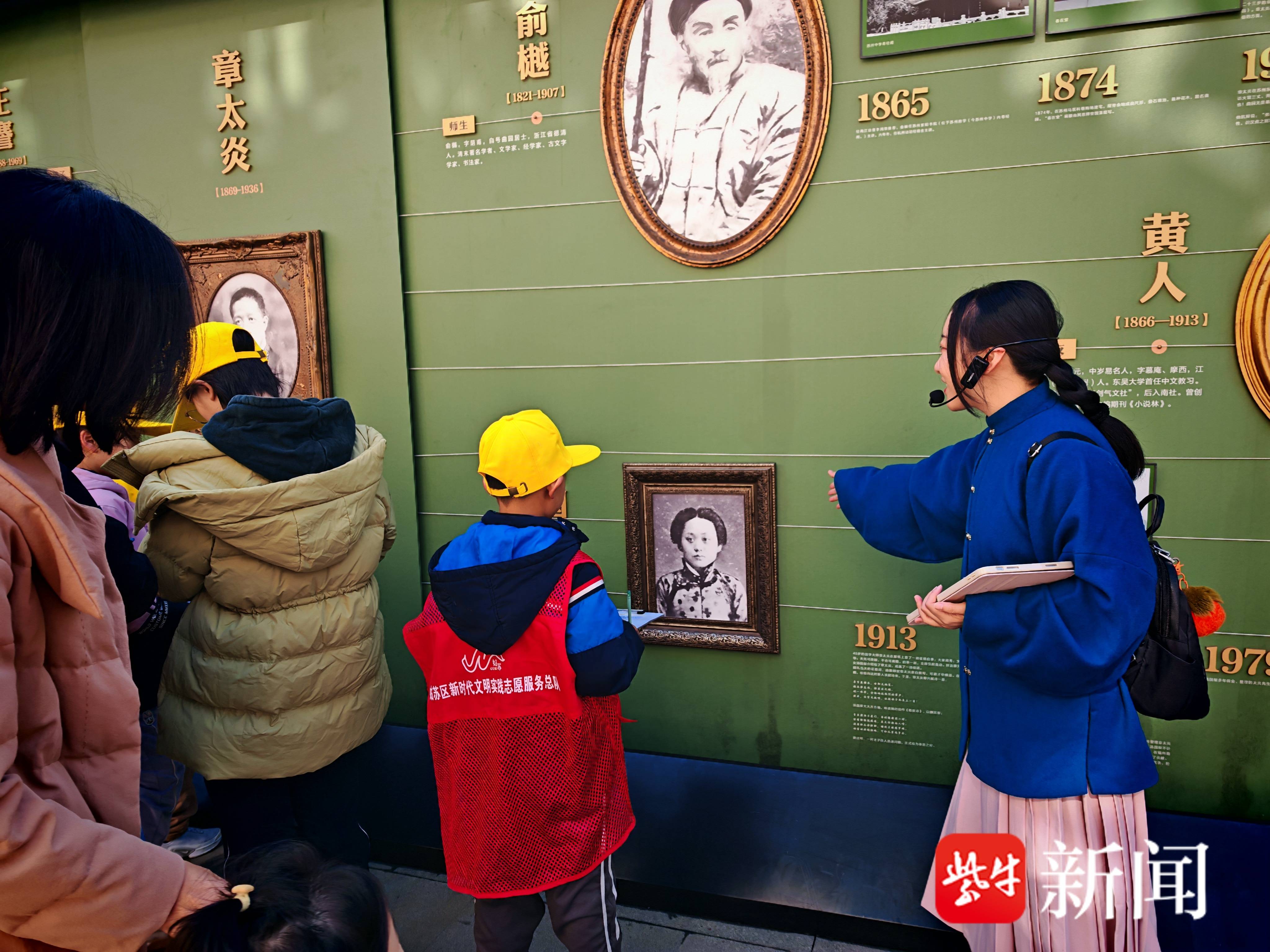 下一站是五卅路纪念碑,学生们在这里停留向烈士们致敬,由志愿者们讲述五卅路革命历史,将五卅精神传承给下一代。大家沿着五卅路走进体育场路,来到乐益女中旧址,百年前柳亚子、叶圣陶、匡亚明等能人志士在这里教书育人。坐在学校的课堂里,志愿者们给学生们上了一课,教学生们说苏州话。一些学生的父母是新苏州人,在志愿者的示范下,学生们开始学习简单的苏州话口语。最后一站是位于锦帆路的章太炎故居,如今这里是“章园”,在保留了一部分民国时期居住场景外,如今古吴轩入驻,“章园”集合了书店、展览、文创、茶咖、文化沙龙等功能为一体的多元文化空间。在志愿者的介绍下,学生们了解了章太炎、俞樾等名人的历史故事。