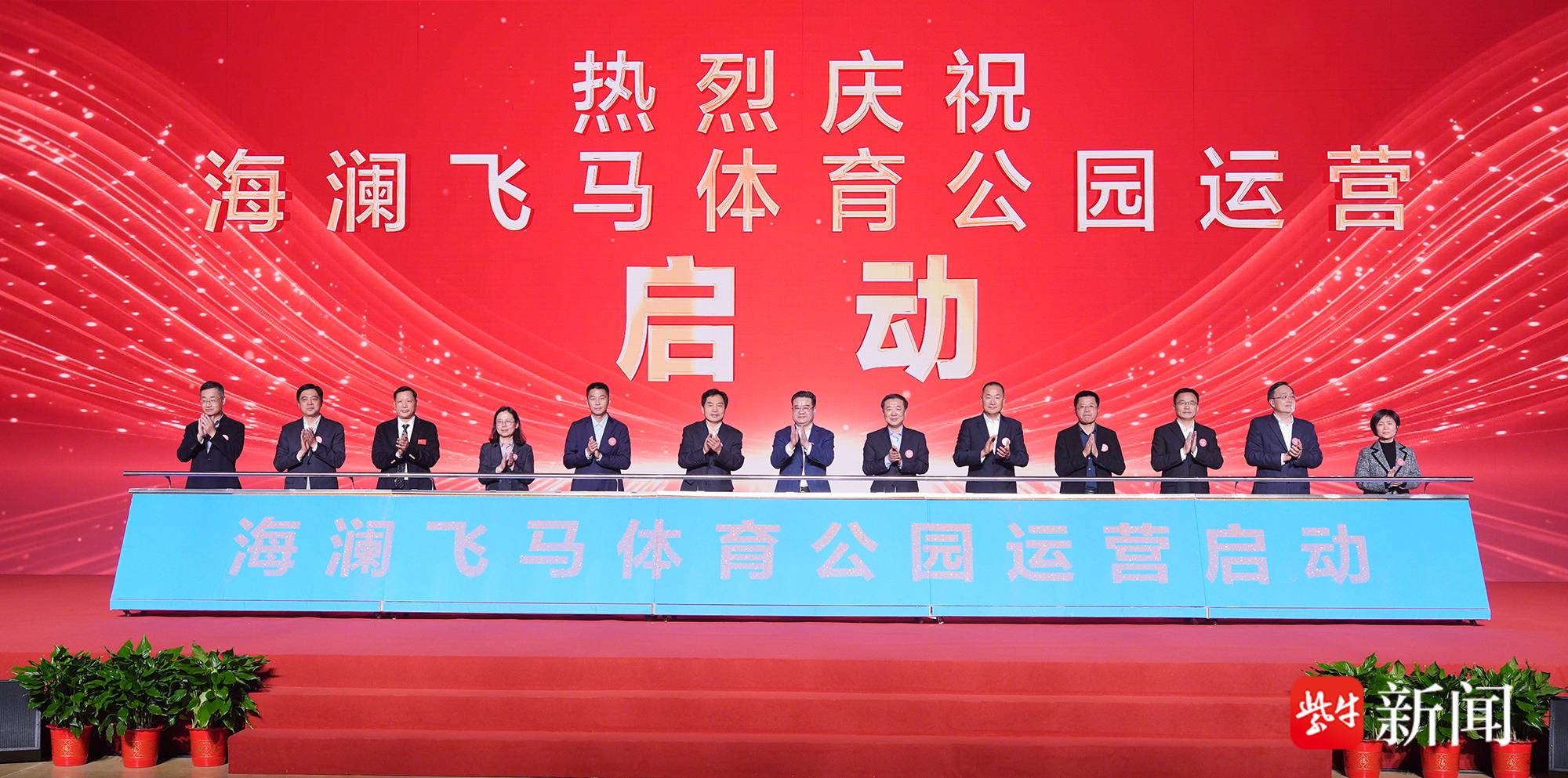 启动仪式上,刘君柱、许峰、冯连世、杨善德、周立宸、张海涛、陈奕、王琪、周建平、计军、邵文松、金丹菁、王文平共同推杆启动海澜飞马体育公园运营。