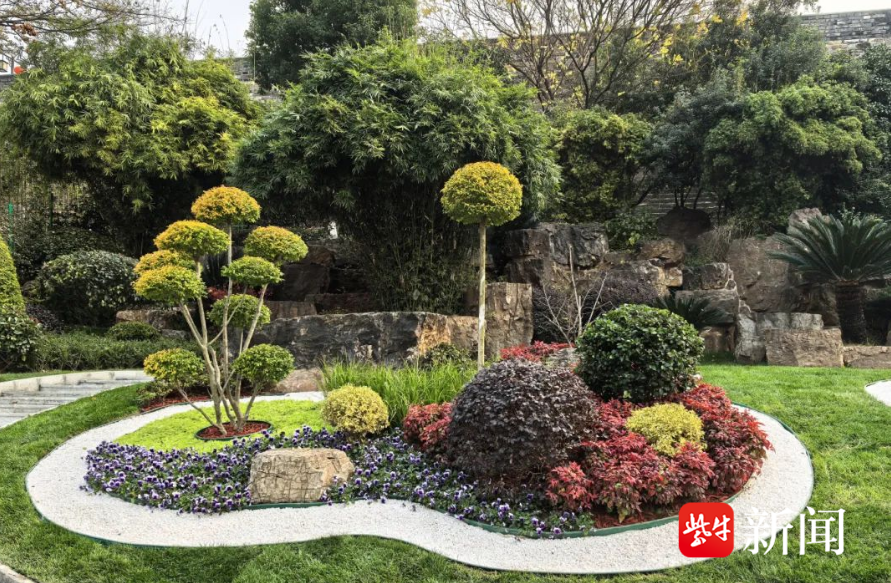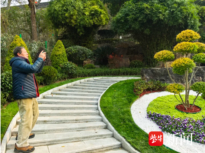 记者在道路沿线看到,绿化景观似乎与往日不同,眼前的景观色彩更清翠,更斑斓。台阶左侧花池内,一株株灌木修剪为上尖下圆的锥形景观,沿阶而上组合成塔式造型。台阶右侧绿化带内新增了两处微型花境,其中一处花境竟然颇似“棒棒糖”,原来这些树是“小叶女贞”,它作为主景,搭配了菖蒲、石楠、三色堇等,最下方铺有白色砂石,与整个景区形成高低错落、色彩丰富的景致。另一处花境,则是在“棒棒糖”中间修剪出一枚绿色的“月亮”,让绿化景观更显精美别致。