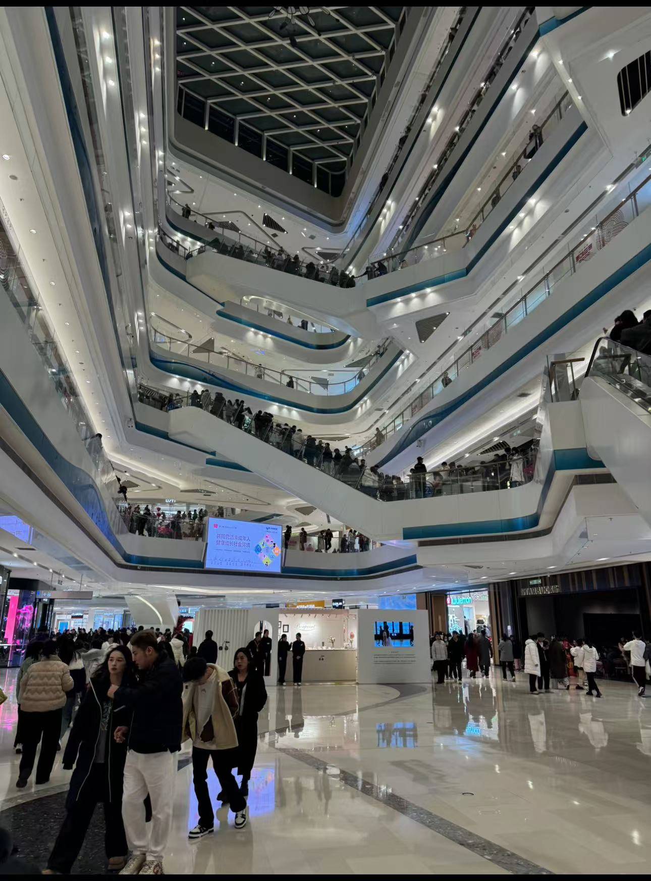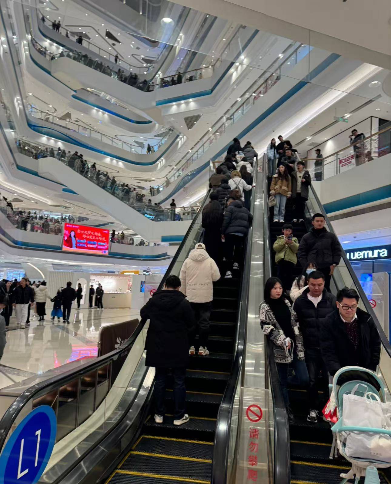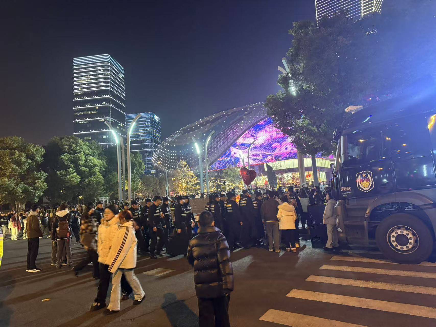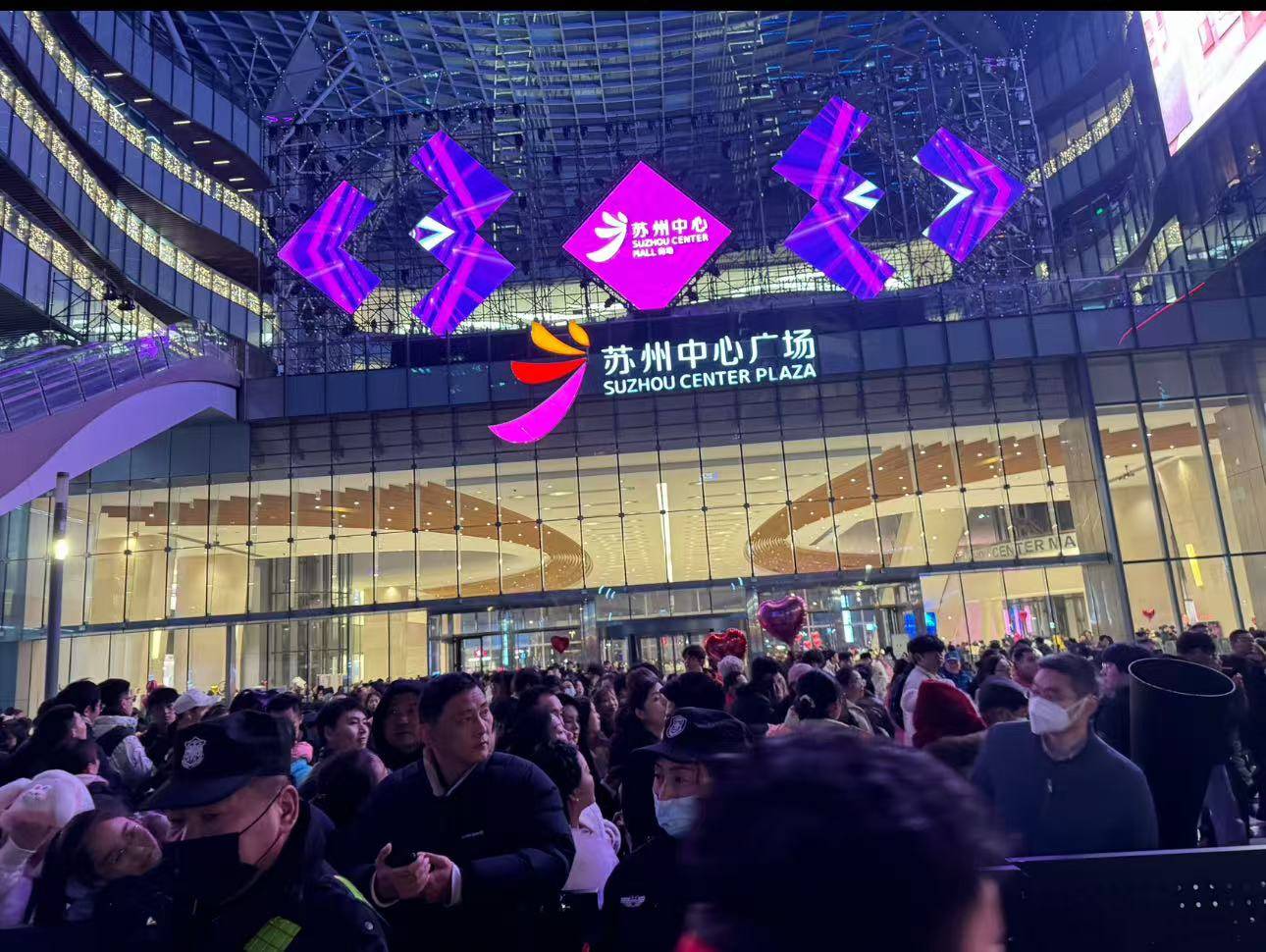 然而,意想不到的是我们尚未到达苏州中心广场门口,已远远看见广场上人山人海,在安保工作人员的维持下,大家正在悄无声息地有序排队。此时此刻,进商场的人黑压压的一大片,在这岁末年初的交替时刻,苏州这座古老而年轻的城市,以其独有的韵味和活力,向世界展示了它独特的魅力。