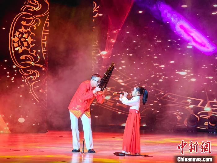 图为徐茂国(左一)带着7岁的徒弟登台合奏。中新网记者乌娅娜摄