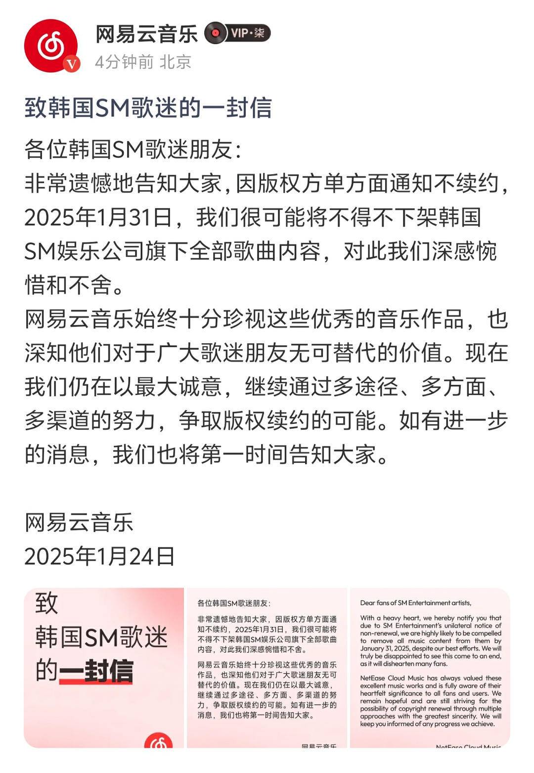 1月24日,网易云音乐发布《致韩国SM歌迷的一封信》,表示因版权方单方面通知不续约,网易云音乐很可能不得不于1月31日下架韩国SM娱乐公司旗下全部歌曲内容。网易云音乐表示,仍在以最大诚意,继续通过多途径、多方面、多渠道的努力,争取版权续约的可能。