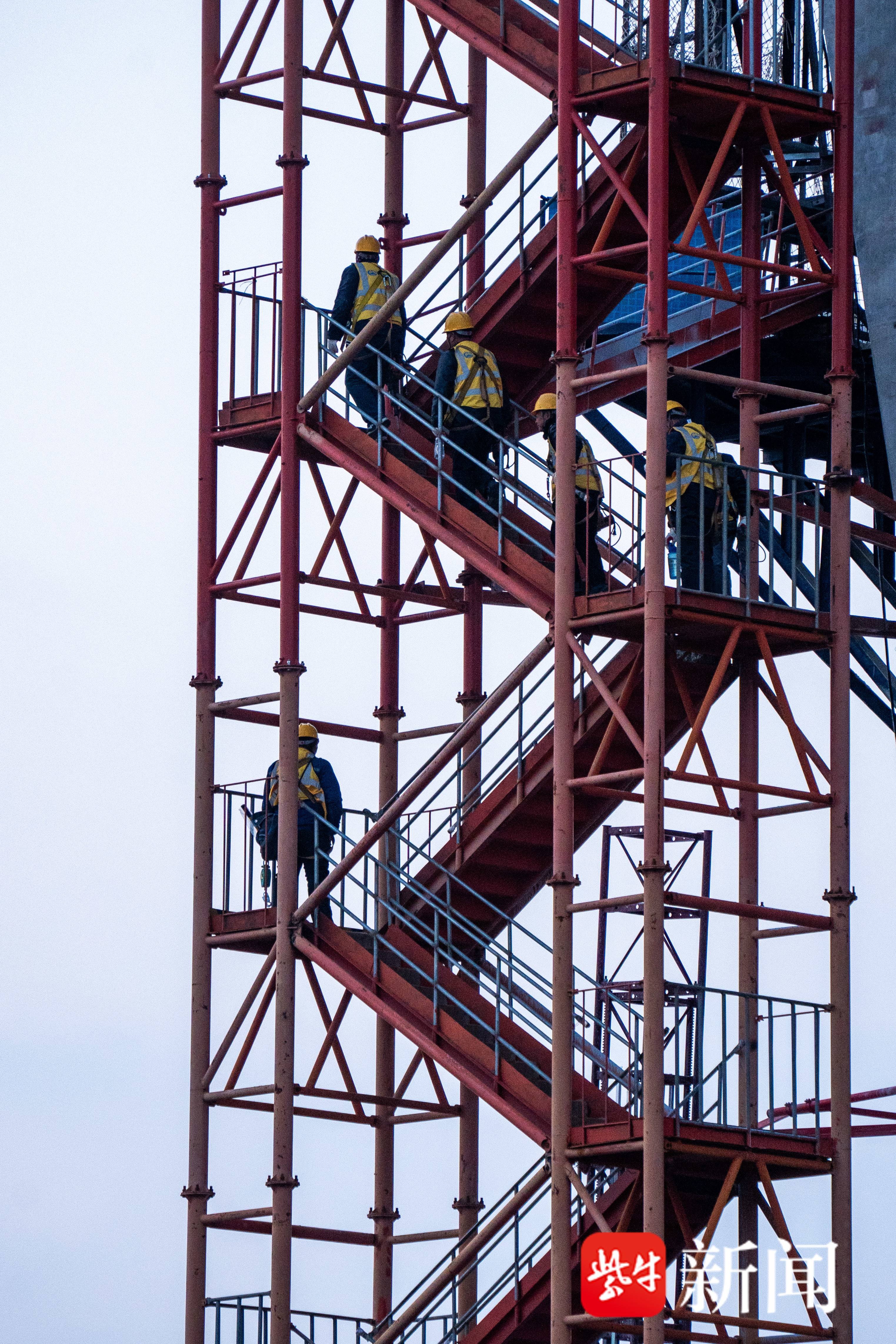 2月7日上午6点30分,身穿中铁蓝的施工人员乘坐着年前刚刚安装好的电梯抵达崇启公铁长江大桥70.65米的主塔高空,进行塔身钢筋绑扎工作,力争在月底实现第12节塔身浇筑,完成开年首个重要节点。