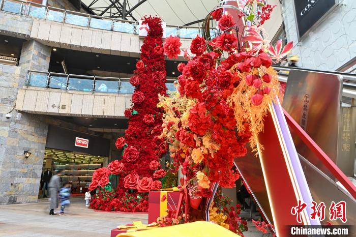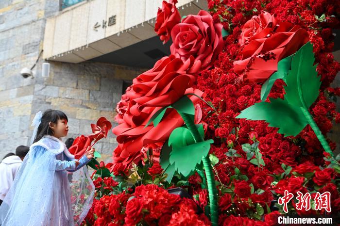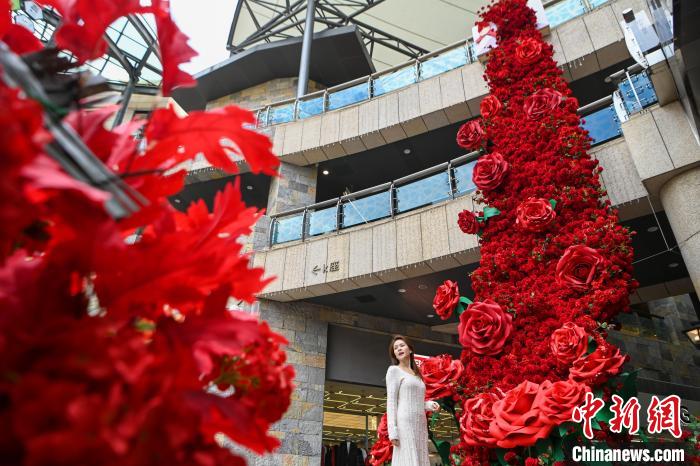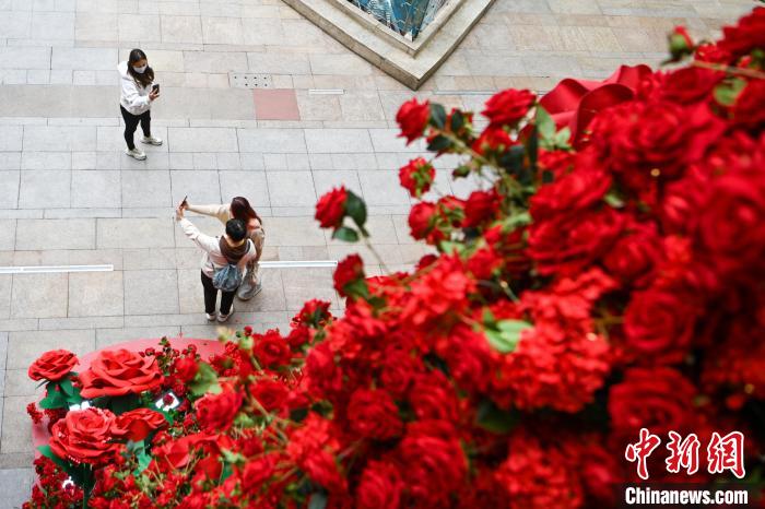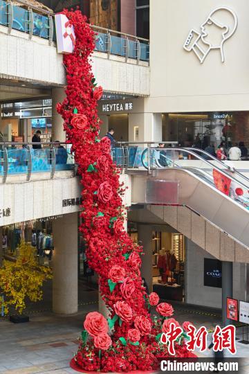 2月10日,市民打卡“玫瑰瀑布”装置景观。近日,云南省昆明市一商圈布置的“玫瑰瀑布”装置景观营造浪漫氛围,吸引不少市民前来打卡、拍照。中新社记者 李嘉娴 摄