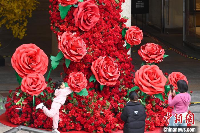 2月10日,“玫瑰瀑布”装置景观吸引小朋友合影。近日,云南省昆明市一商圈布置的“玫瑰瀑布”装置景观营造浪漫氛围,吸引不少市民前来打卡、拍照。中新社记者 李嘉娴 摄