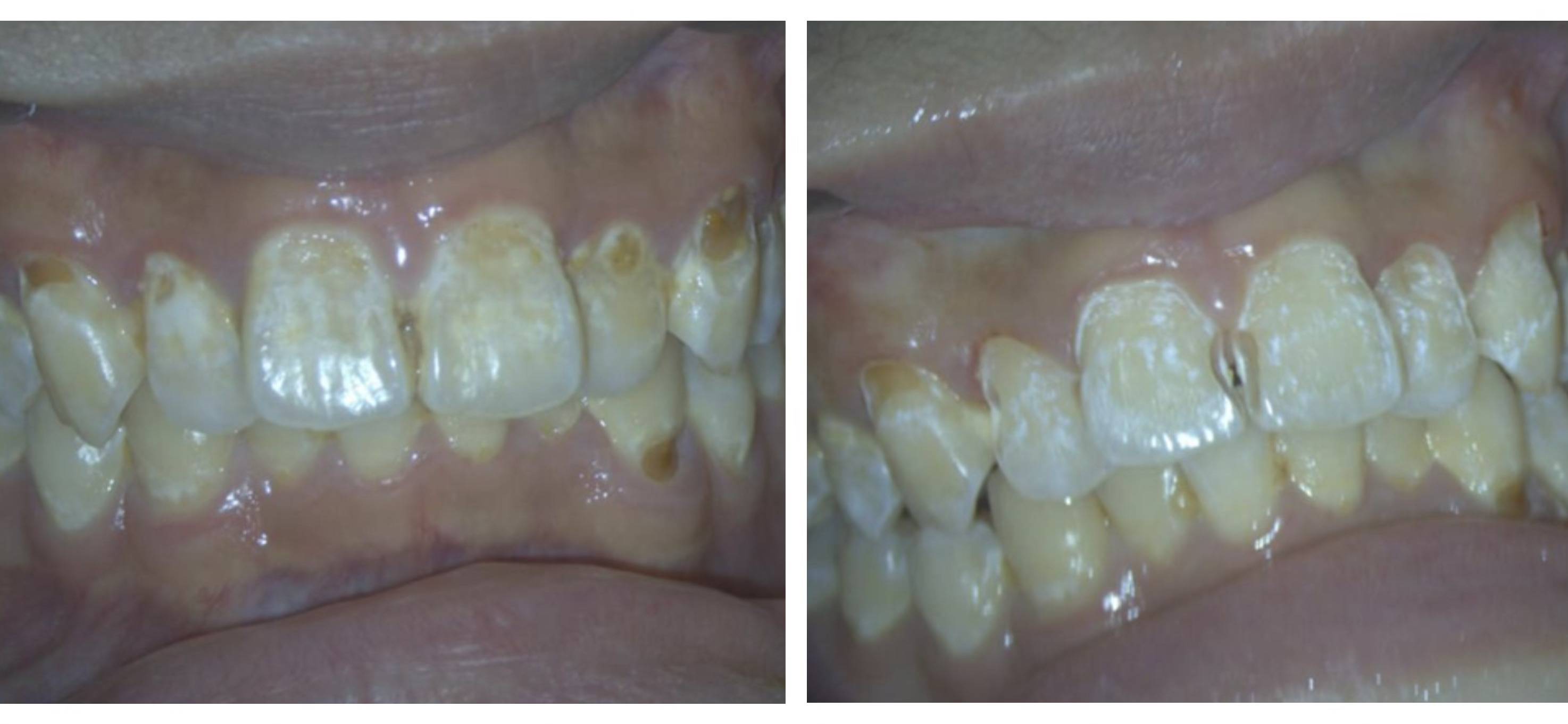 猛性龋(又称猖獗龋、放射性龋)是一种特殊类型的急性龋病,通常6-12个月内即可导致全口多数牙齿脱矿、龋洞形成,甚至仅剩残根。近年来,临床上青少年患有猛性龋越发常见,陈耀忠介绍说:“这些孩子龋齿情况有轻有重,但共同的特点就是引起龋坏或脱矿的牙齿数目多,不是单颗牙齿,而是数颗;其次,前牙唇面较重。”