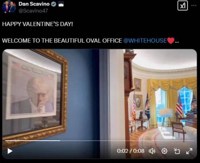 2月14日,白宫办公厅副主任丹·斯卡维诺在社交媒体平台上发布了一段视频,显示出这张照片所在的具体位置,并配文“情人节快乐,欢迎来到美丽的椭圆形办公室”。