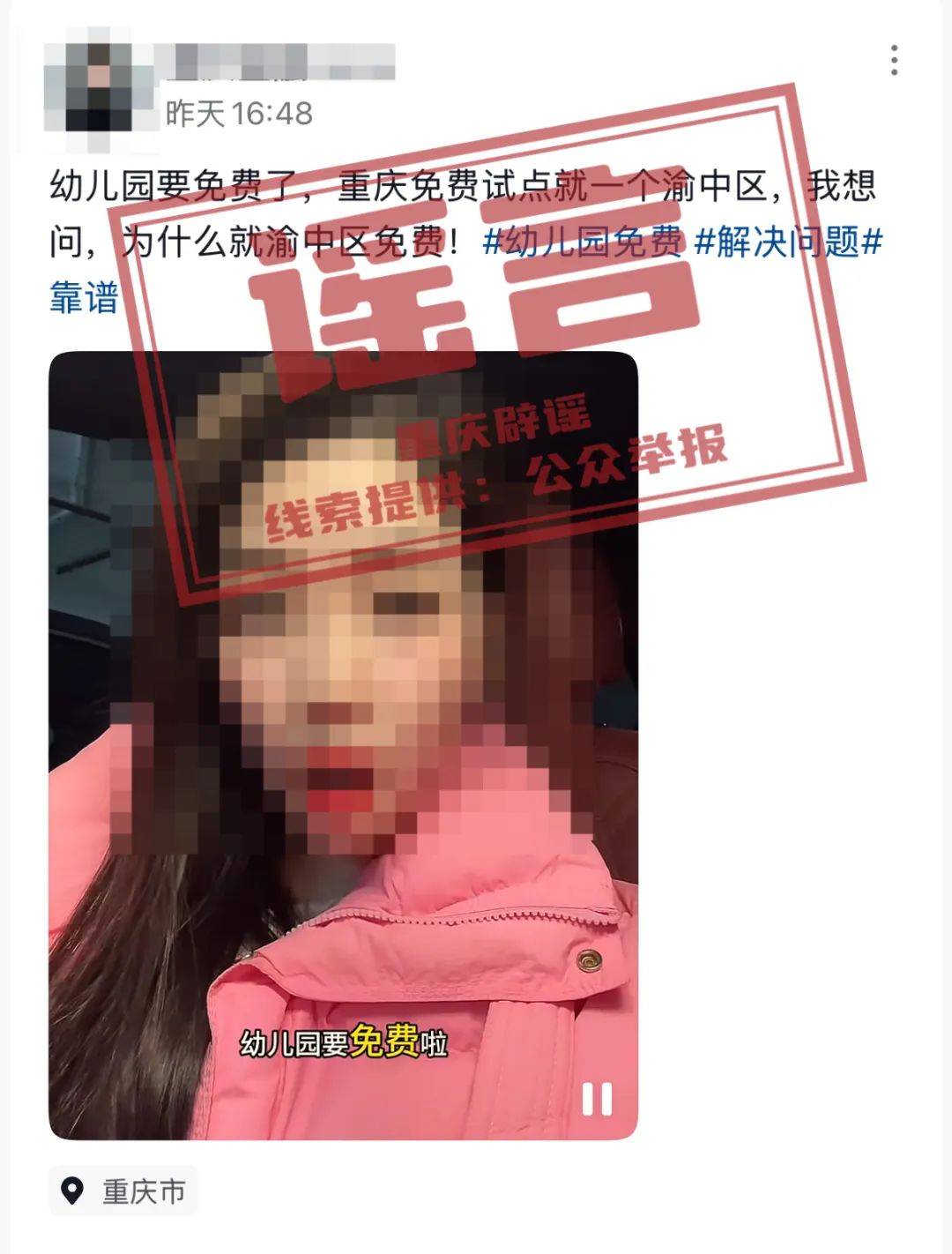 近日,某网民在互联网平台发布信息称“幼儿园要免费了,重庆免费试点就一个渝中区”,引发关注。经核实,网传信息系谣言。