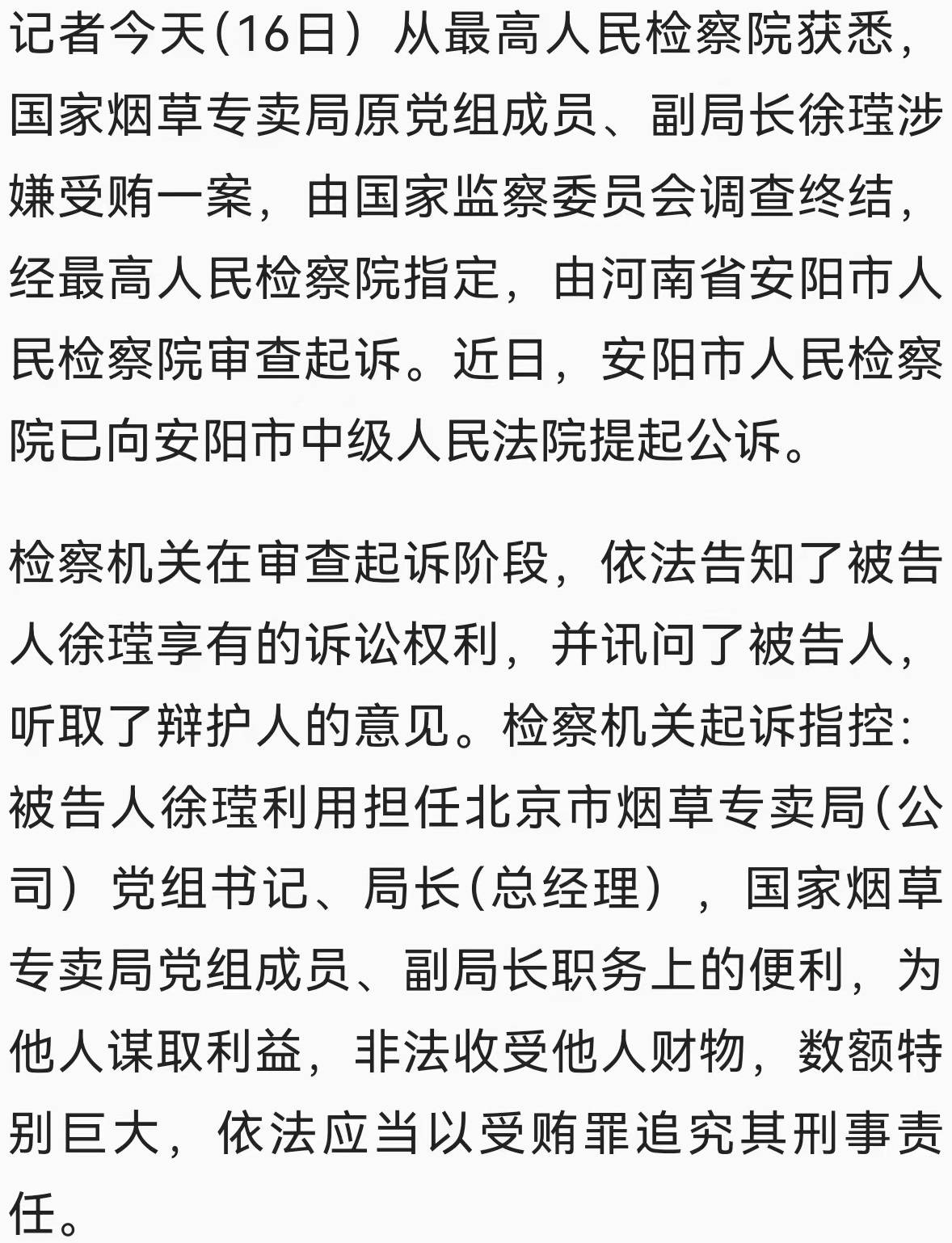 涉嫌受贿 国家烟草专卖局原副局长被提起公诉