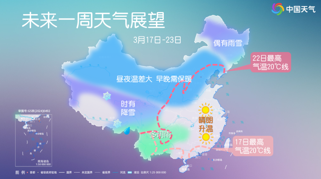 随着冷空气离场,本周(3月17日至23日),全国大部将转为受高压脊控制。在阳光的加持下,晴暖升温将成为主旋律,各地气温将从之前的偏低状态迅速切换为偏高。