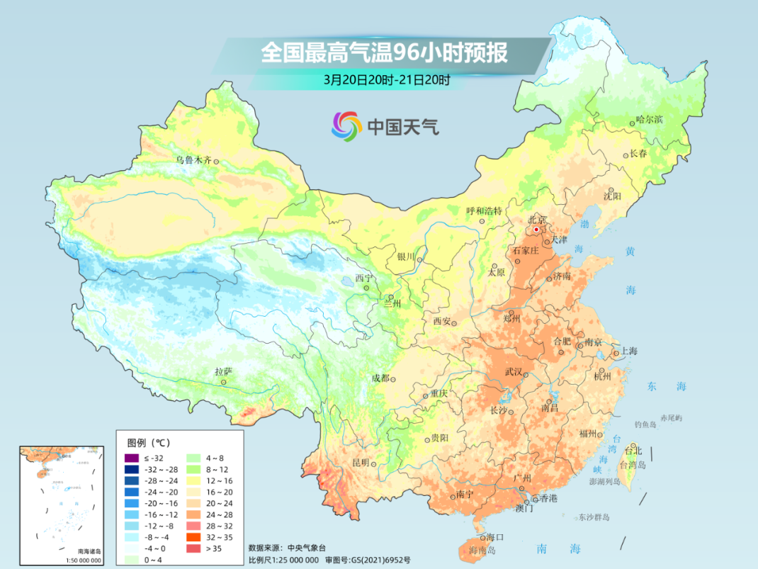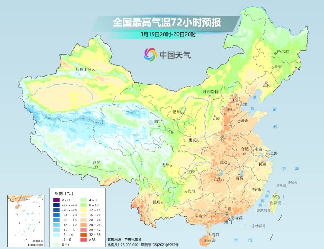 最高气温20℃线将从华南地区一路向北,推进到东北地区南部一带;