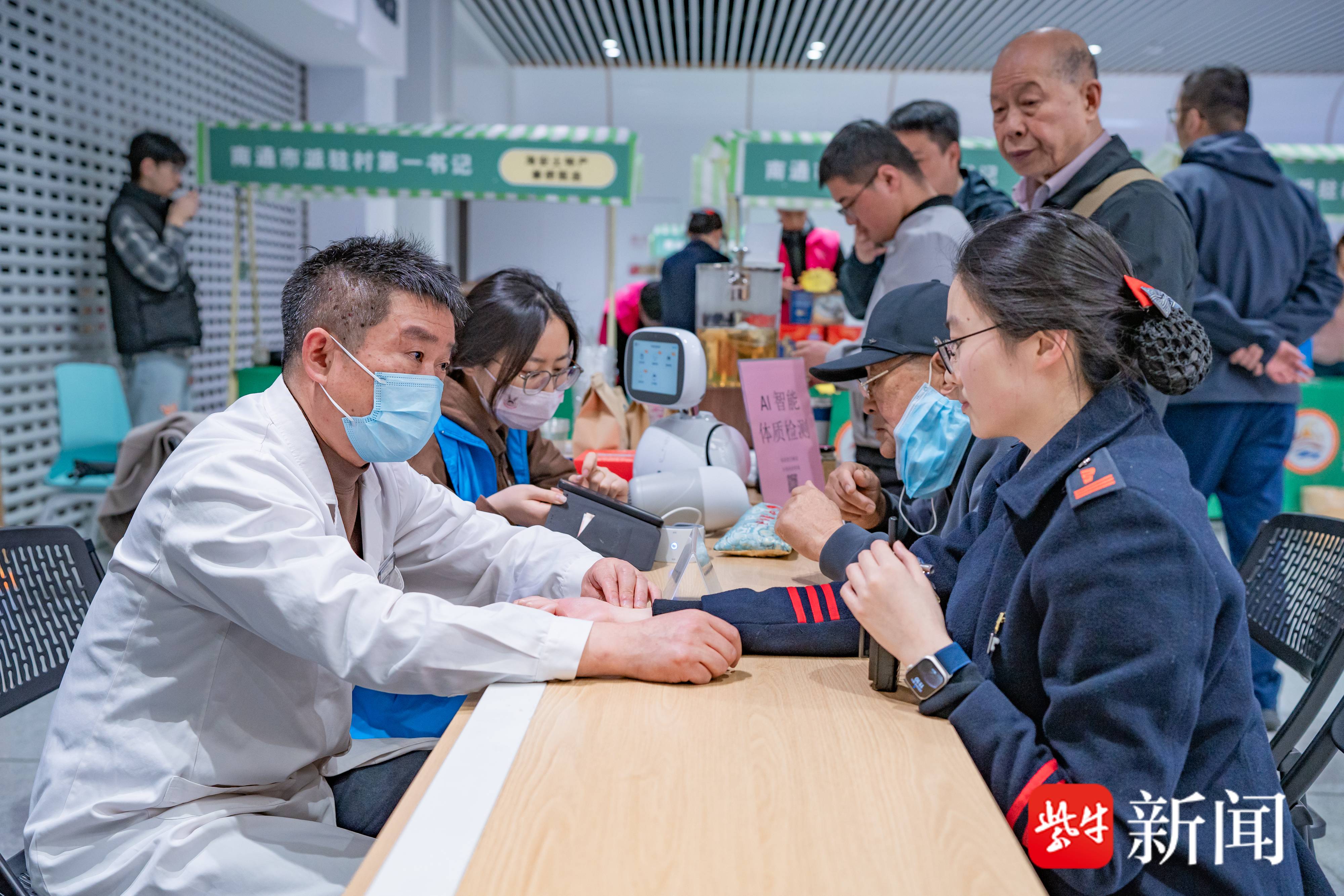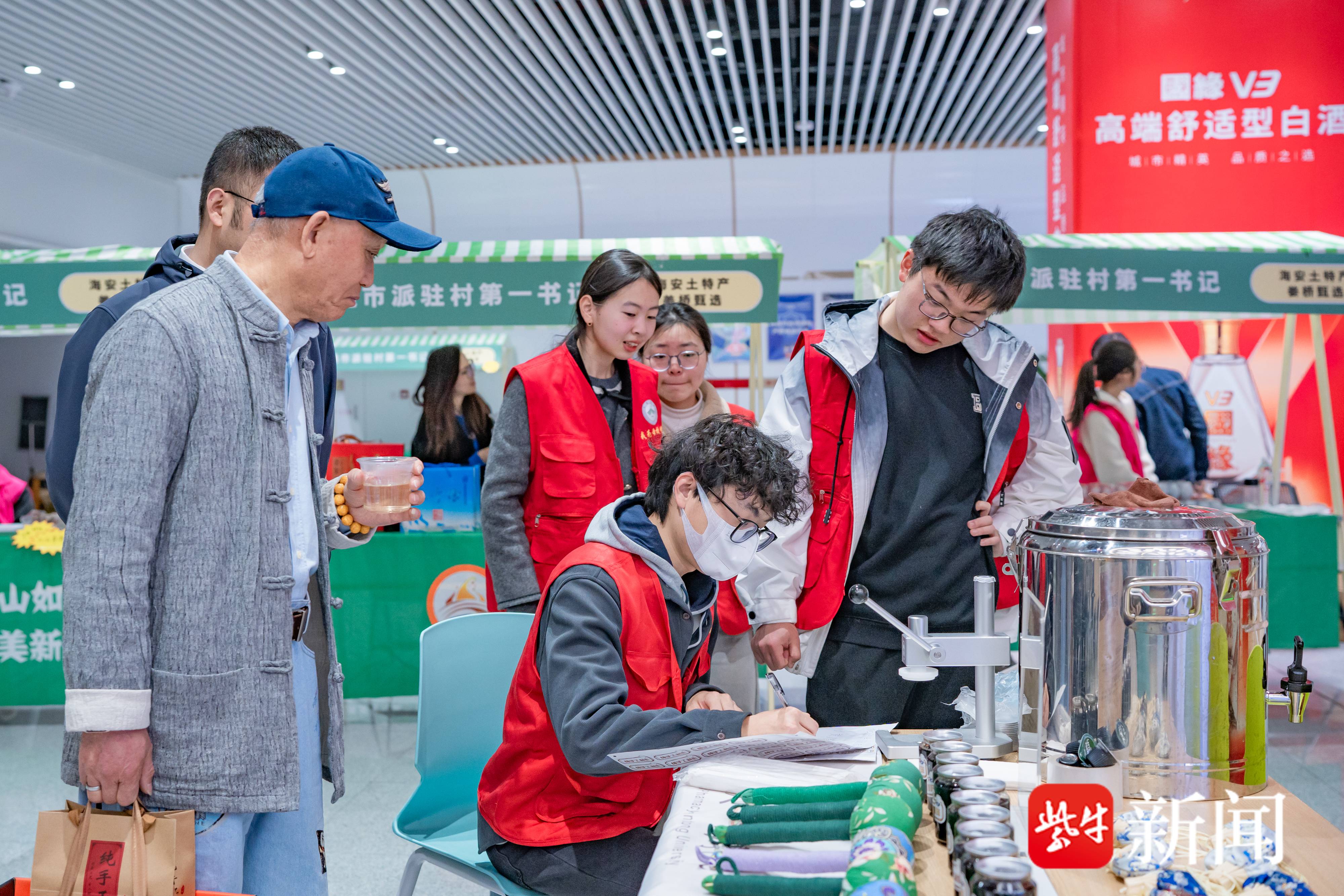 健康生态农产品展销区前亦是热闹非凡。海安市大公镇姜桥村驻村第一书记、南通市中医院骨伤科副主任医师王盛,与村助农工作队热情地向市民推介桑果黄酒、苏琪脆饼、麻虾酱、河豚鱼等海安特色农产品,并贴心附上 “养生说明”,让市民吃得明白、健康。