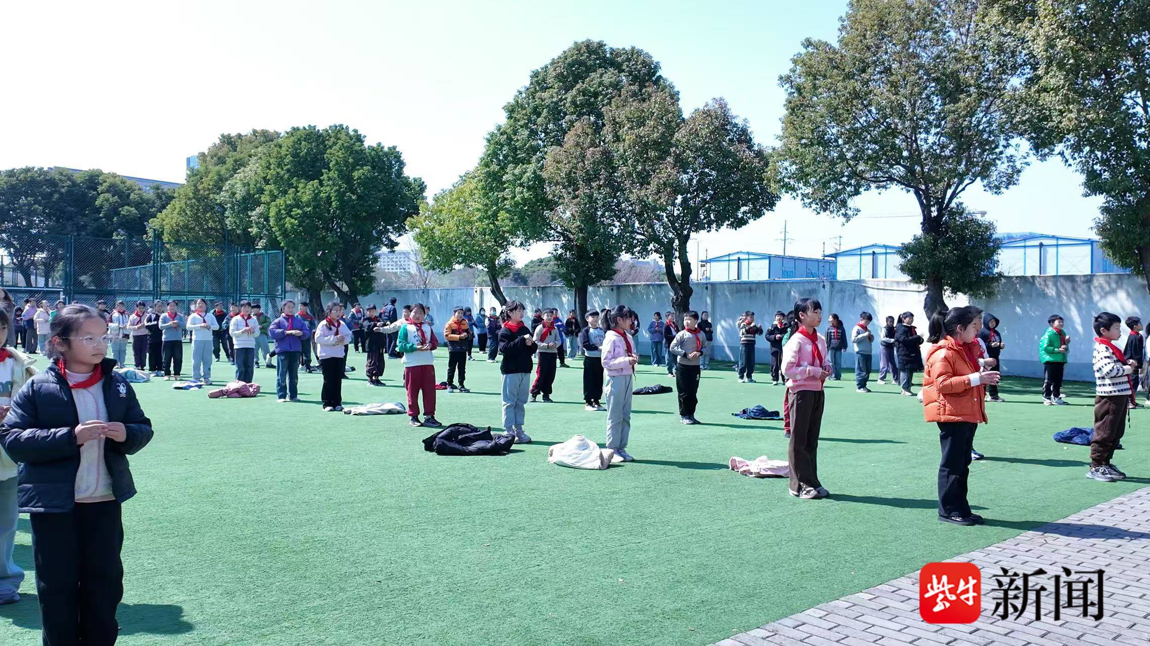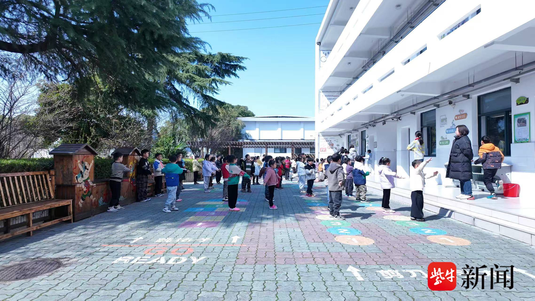 上午10点10分,扬子晚报/紫牛新闻记者来到校园看到,随着下课铃的响起,学生们走出教室,在走廊有序列队,前往操场开启课间30分钟的“蓄能时间”。伸展、弯腰、踢腿.......在老师的指导下,孩子们以饱满的精神,进行广播体操运动,每一个动作都整齐规范,学生们脸上洋溢着蓬勃的朝气。