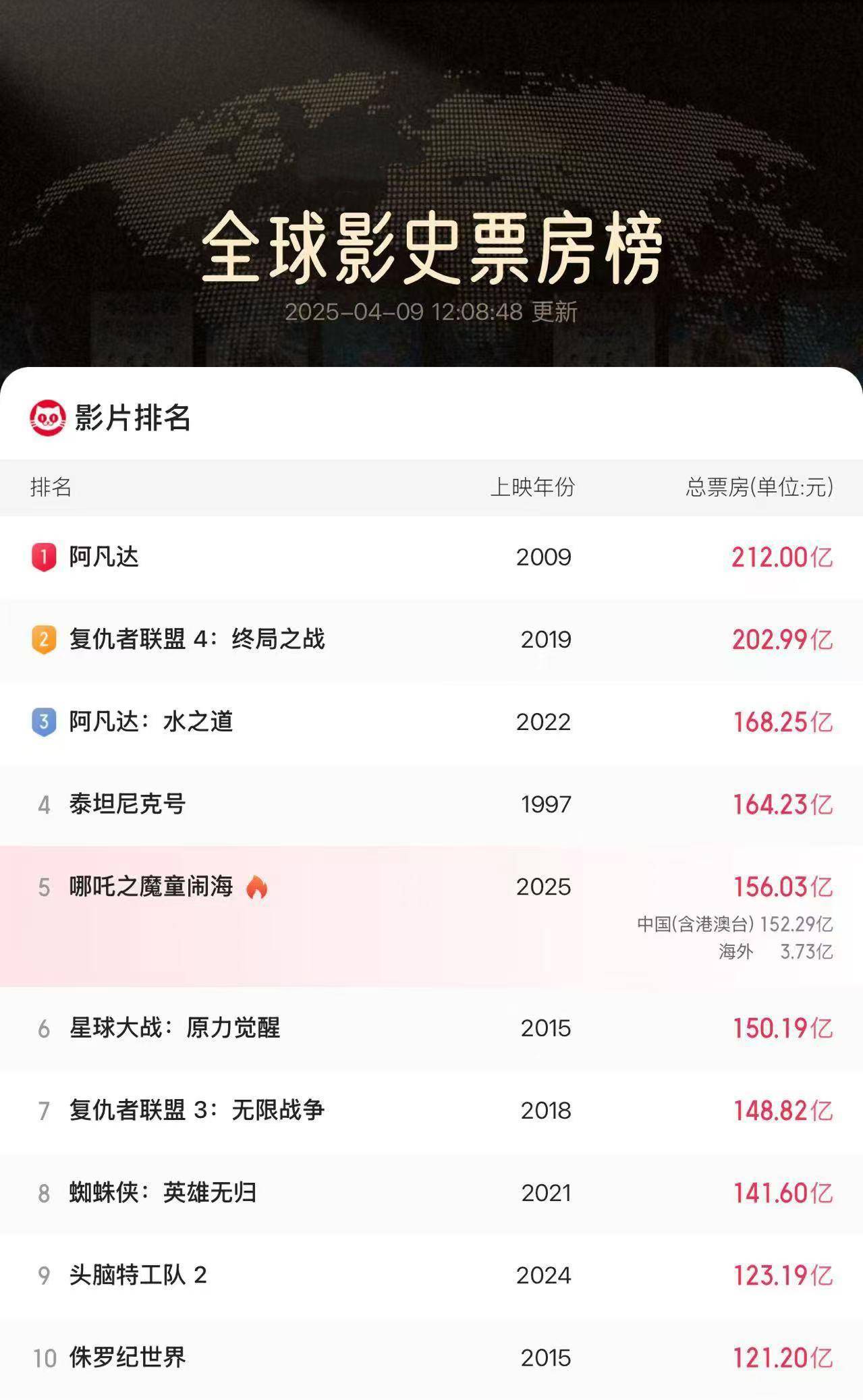 暂列全球影史票房榜前5