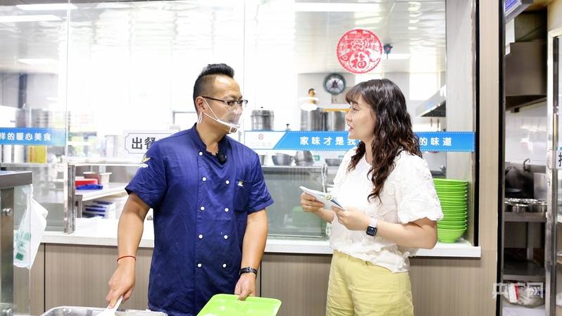 社区网格员正在协调厨师按照老年人建议调整饭菜口味(央广网记者 齐平 摄)