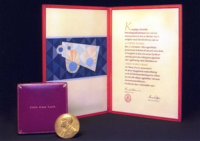 1956年,他与李政道共同发表论文,提出了在弱相互作用下宇称可以不守恒的思想,并提出了可能的实验检验方案。这个革命性的观念很快被吴健雄等人的实验证实。杨振宁与李政道“因他们对宇称不守恒定律的深刻探索以及由此带来的基本粒子领域的许多重要发现”,获得1957年诺贝尔物理学奖,共同成为最早获得诺贝尔奖的中国人。