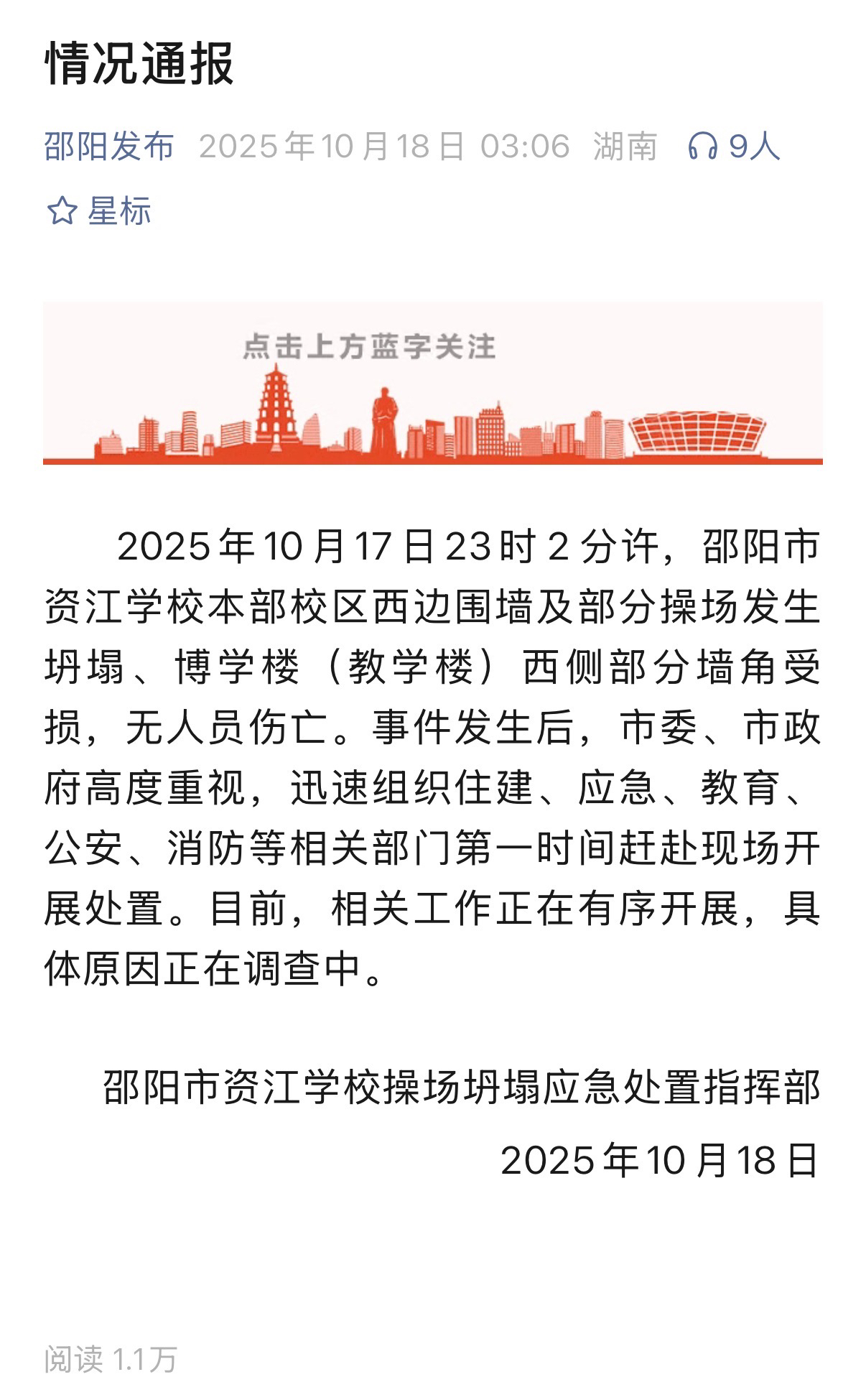 2025年10月17日23时2分许,邵阳市资江学校本部校区西边围墙及部分操场发生坍塌、博学楼(教学楼)西侧部分墙角受损,无人员伤亡。事件发生后,市委、市政府高度重视,迅速组织住建、应急、教育、公安、消防等相关部门第一时间赶赴现场开展处置。目前,相关工作正在有序开展,具体原因正在调查中。