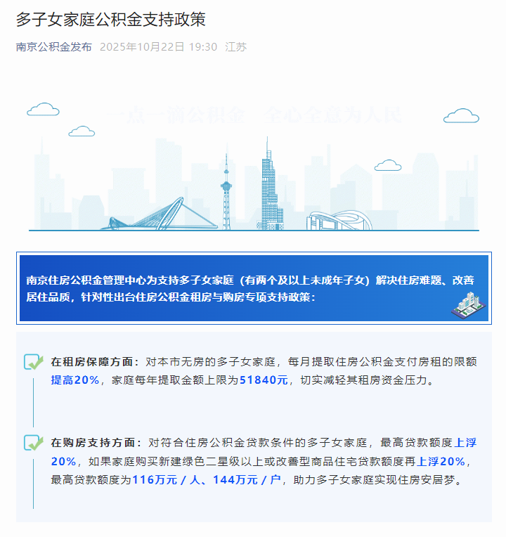 10月9日,南京公积金中心发布《关于提高住房公积金贷款额度》的通知,宣布将个人公积金贷款的最高额度由50万元/人提高至80万元/人,家庭(夫妻双缴存人)公积金贷款最高额度仍为100万元/户,该政策有效期至2027年12月31日。在该通知中明确,多子女家庭申请住房公积金贷款最高额度上浮20%,即额度调整后的最高可贷额度为96万元/人、120万元/户。在“可叠加计算贷款最高额度的相关情形”中,该通知中表示“多子女家庭或参与住房‘以旧换新’活动,申请住房公积金贷款购买新建绿色二星级(含)以上或经认定的新建改善型住房上浮额度可两相叠加计算,即额度调整后的最高可贷额度为116万元/人、144万元/户。”