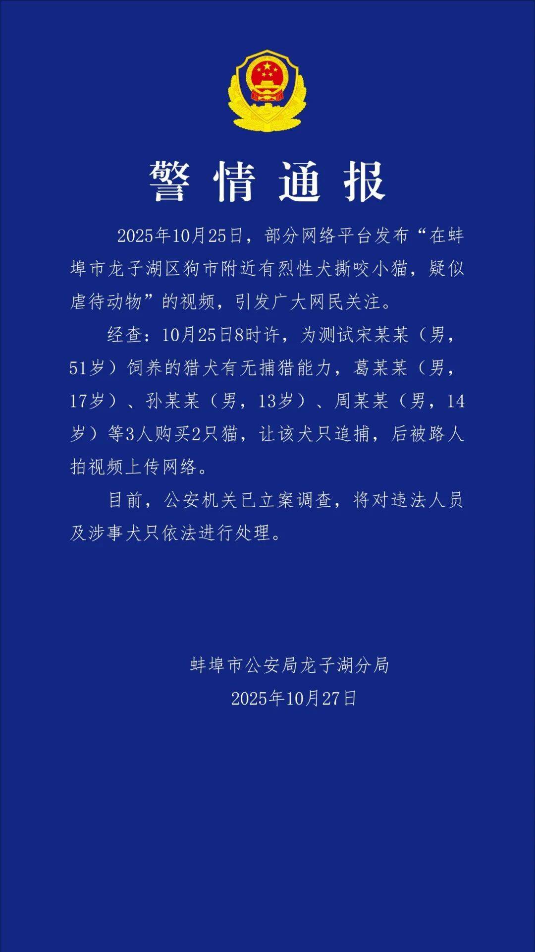 安徽蚌埠通报“狗市附近有烈性犬撕咬小猫”:将对违法人员及涉事犬只依法进行处理
