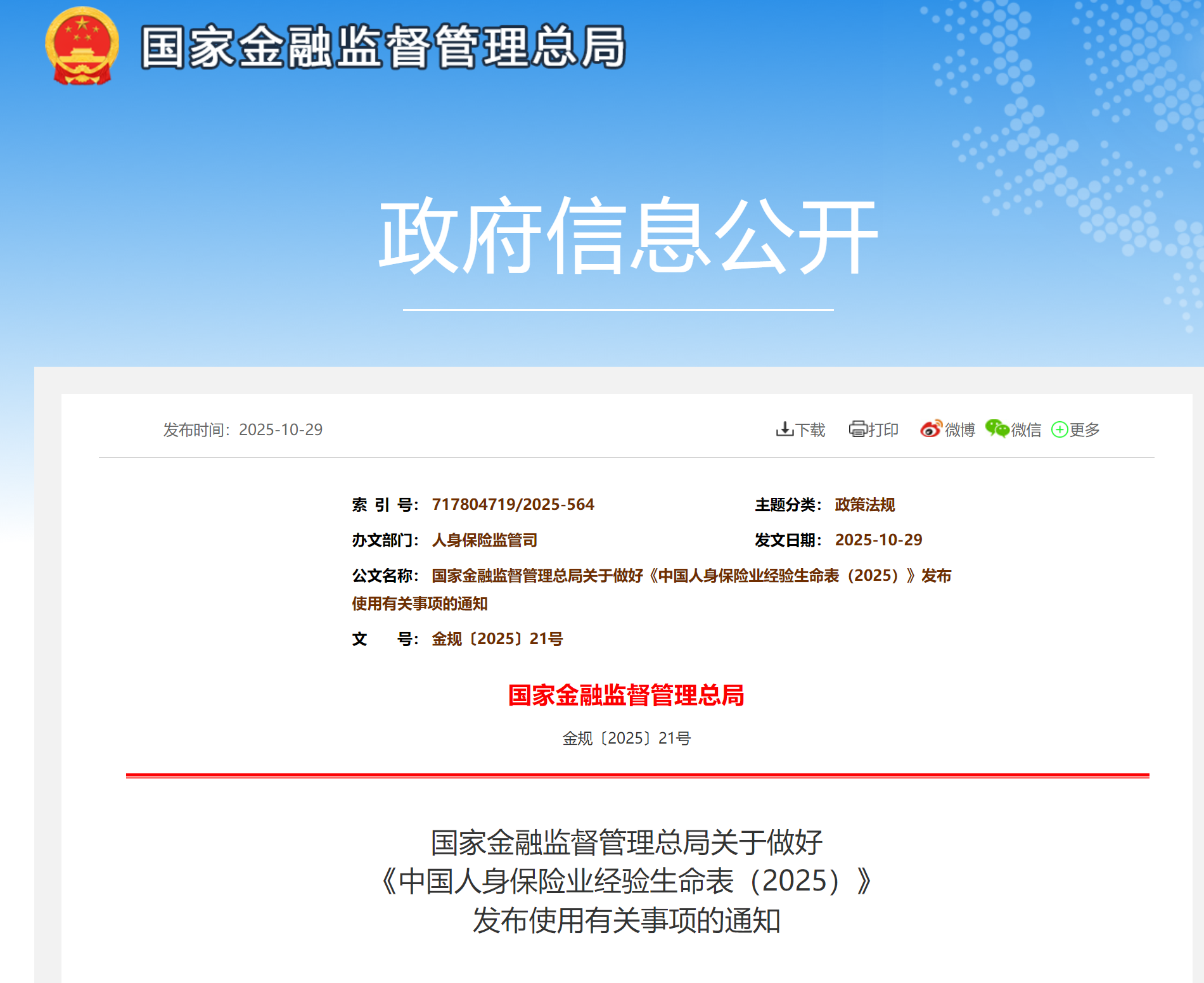时隔10年,人身险“新标尺”落地。金融监管总局指导精算师协会编制了《中国人身保险业经验生命表(2025)》(简称第四套生命表)。为规范科学使用,10月29日,金融监管总局印发《关于做好<中国人身保险业经验生命表(2025)>发布使用有关事项的通知》(简称《通知》)。《通知》自2026年1月1日起实施。