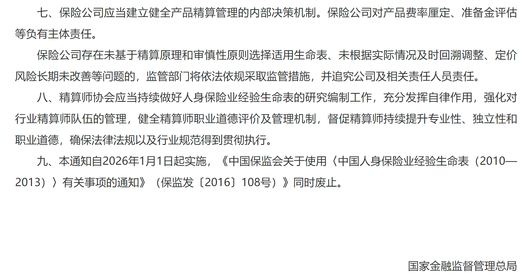 1996年,我国第一套生命表发布,之后,为及时反映我国人口结构和死亡率变化趋势,人身保险业每10年编制完善一次生命表,分别于2005年和2016年发布第二套和第三套生命表。2025年,精算师协会编制了第四套生命表,此次编制采集了行业近10年全量保单数据,数据样本量全球保险市场第一。经过多轮测算论证,第四套生命表能够客观科学反映行业当前和今后一段时期保险人群生存和死亡概率,数据成熟可靠。为推动行业规范使用生命表,更好发挥精算在风险保障与风险计量等方面的关键作用,保护消费者合法权益,金融监管总局制定了《通知》。