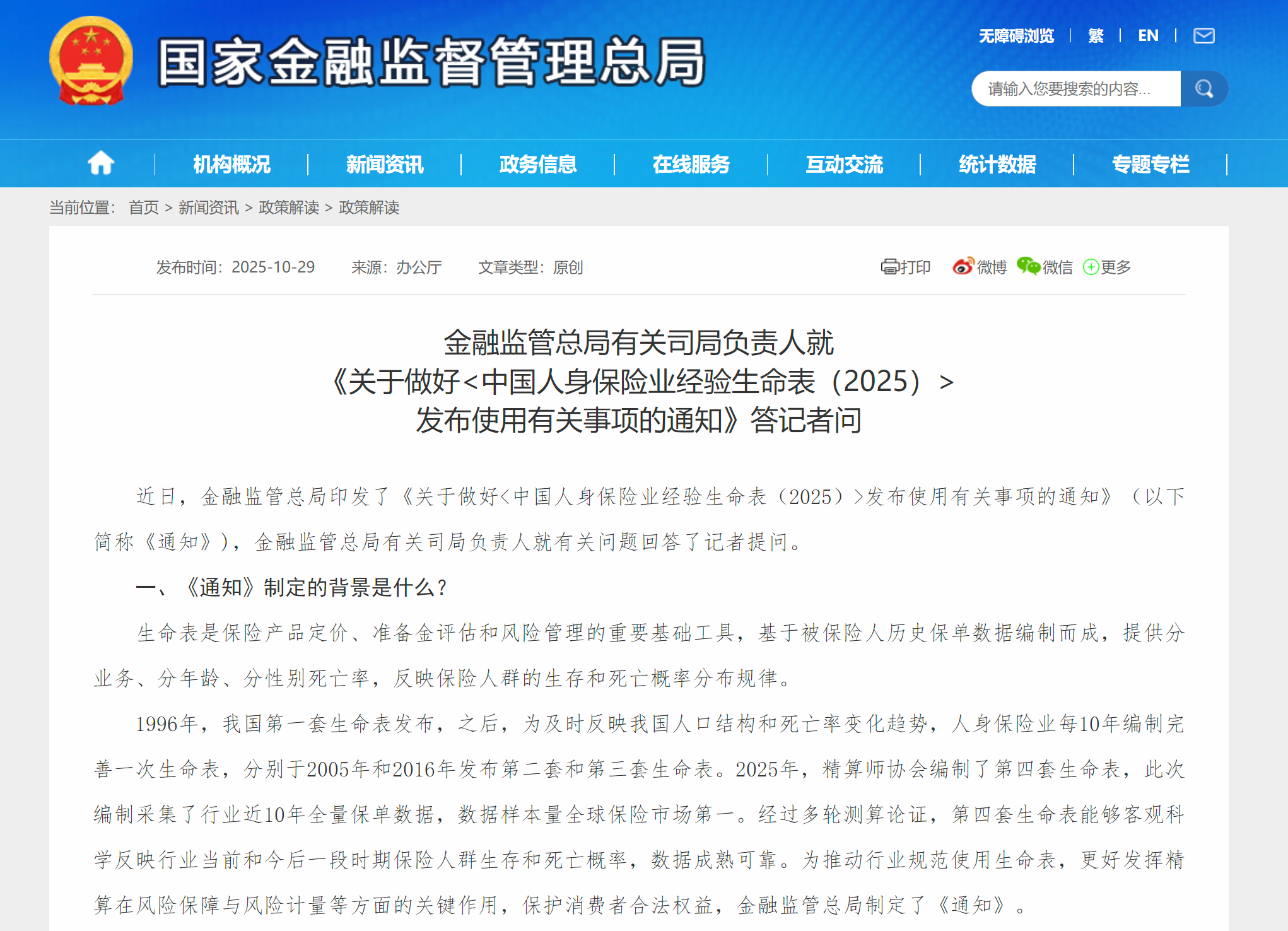 金融监管总局有关司局负责人在答记者问中介绍,生命表是保险产品定价、准备金评估和风险管理的重要基础工具,基于被保险人历史保单数据编制而成,提供分业务、分年龄、分性别死亡率,反映保险人群的生存和死亡概率分布规律。